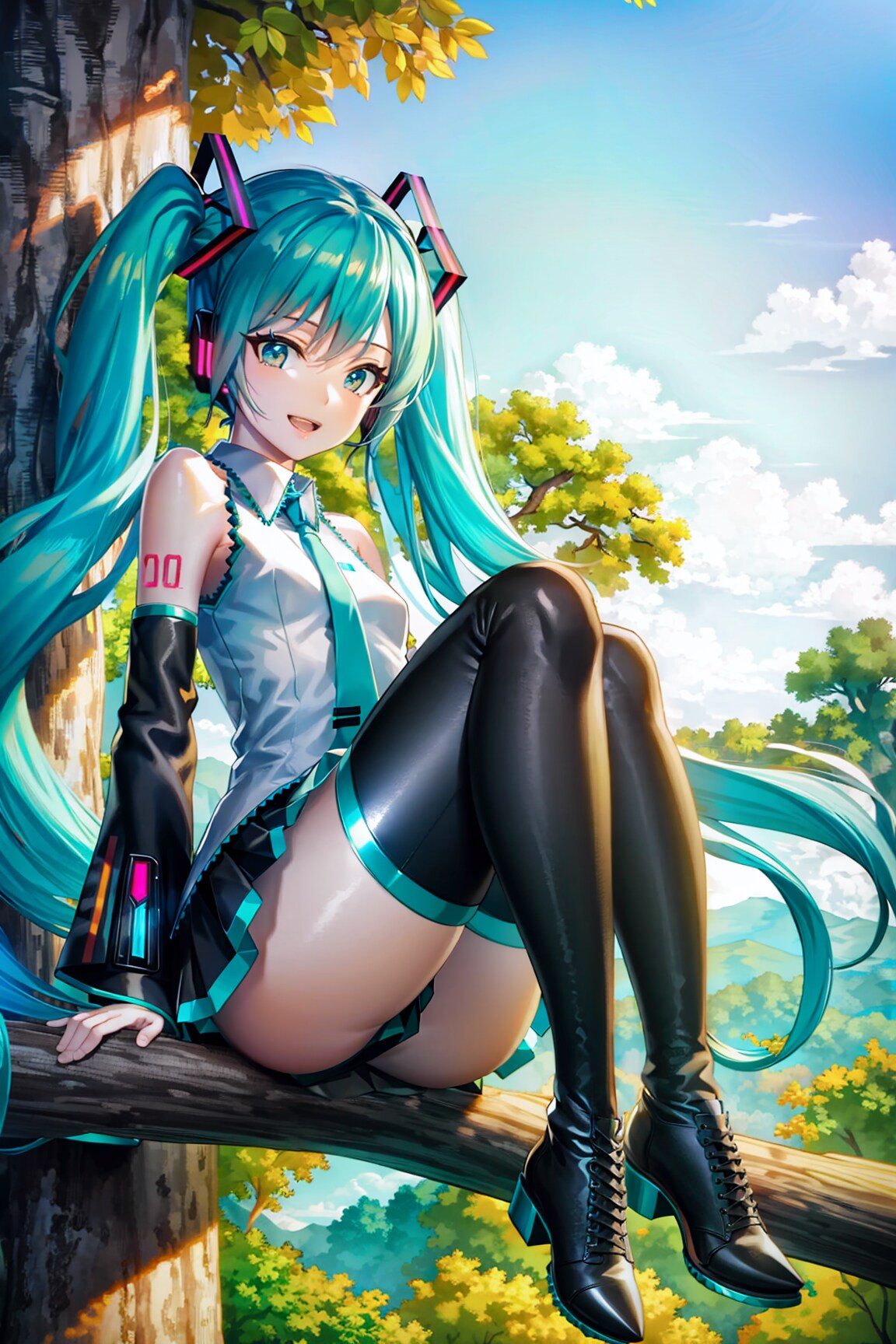 +hatsune miku (sitting on branch of bare tree:1.15), full body, (midair:1.2)