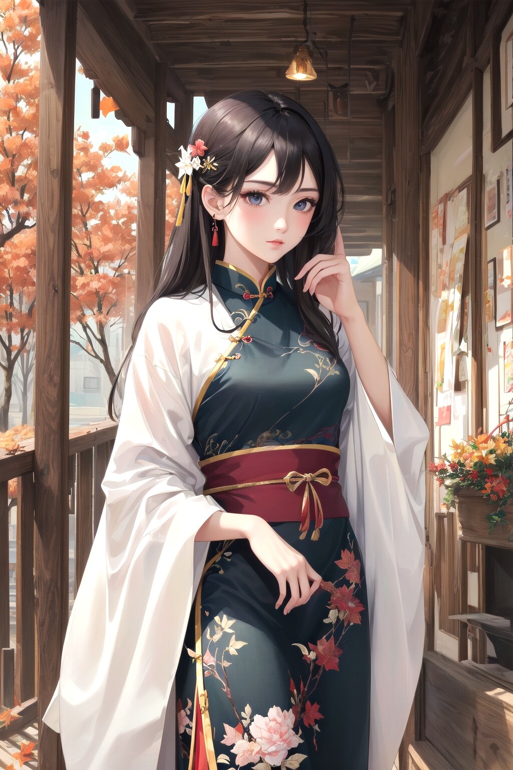 1女の子、秋、漢服、チャイナドレス、チャイナ髪、暖かい色、カウボーイショット、詳細な背景