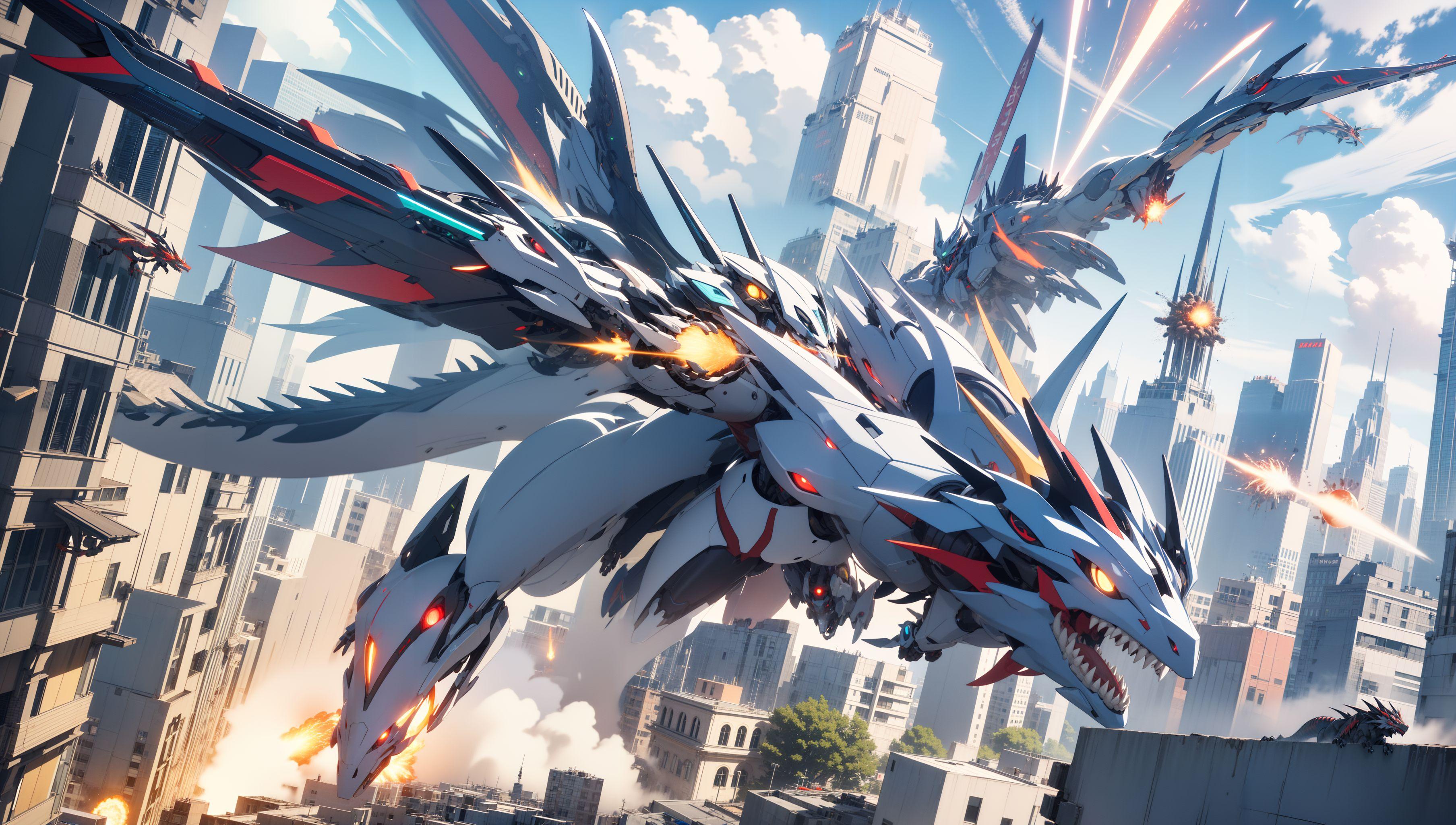 mecha dragon, Over the city, explosion, bombing, hologram, glowing eye,