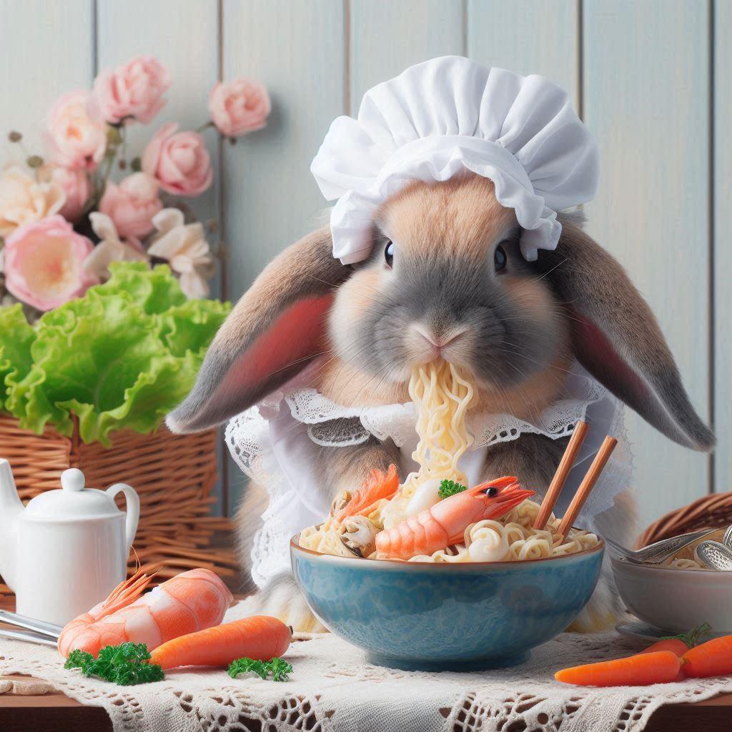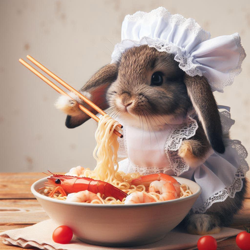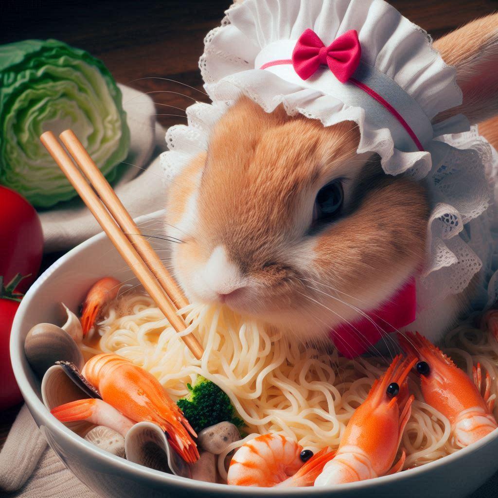 海鮮麺を食らうウサギ