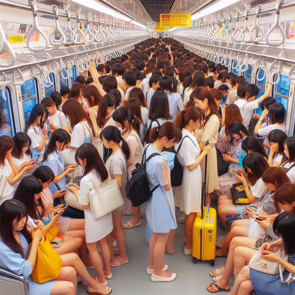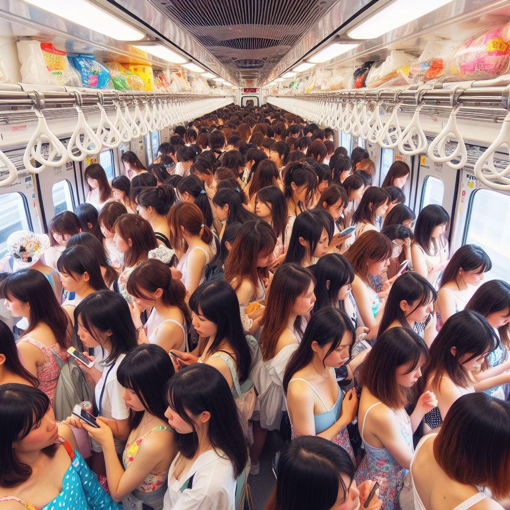 日本では、海水浴に行くにも満員電車😄