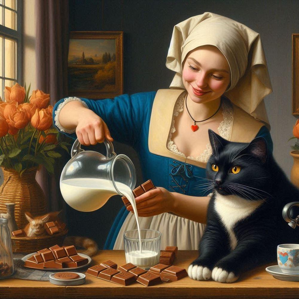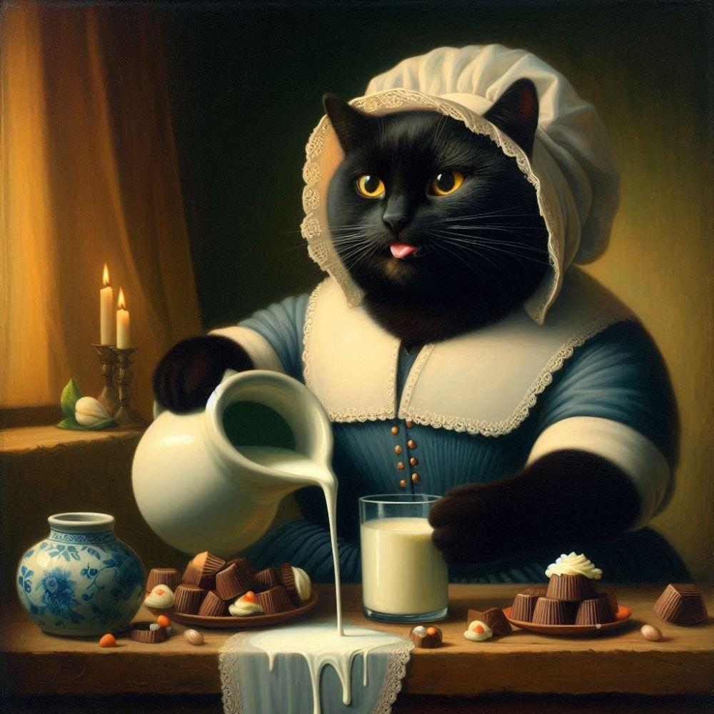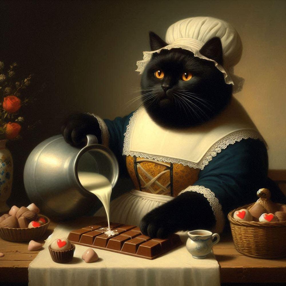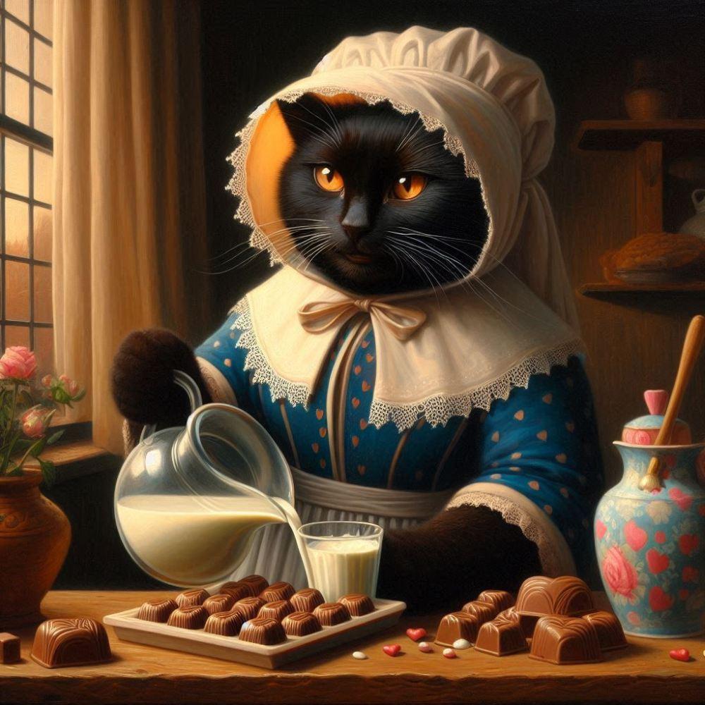 油彩ファンタジー、バレンタインチョコに牛乳を注ぐ猫