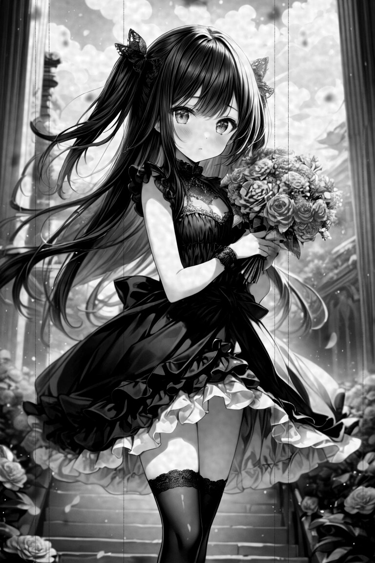モノクロということで、ゴスロリファッションのうちの子と廃墟で生成してみました。ゴスロリファッションお題の経験が生かされました。