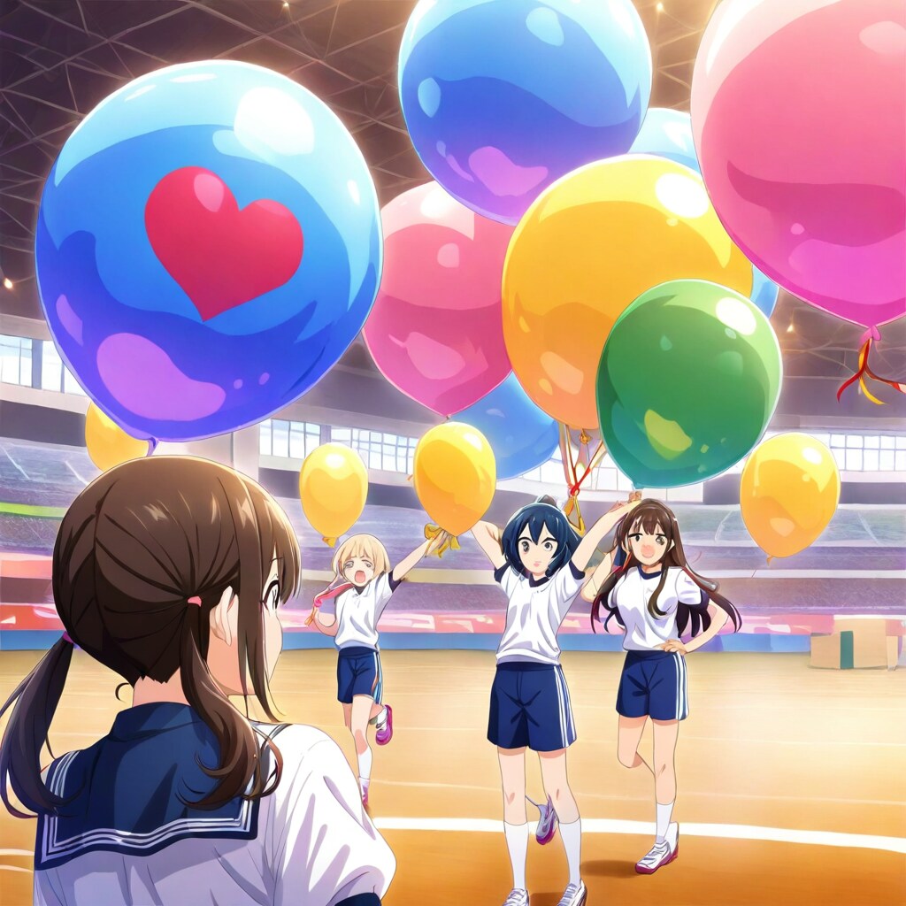 グラウンドで色とりどりの巨大風船を膨らませている体操服の美少女。