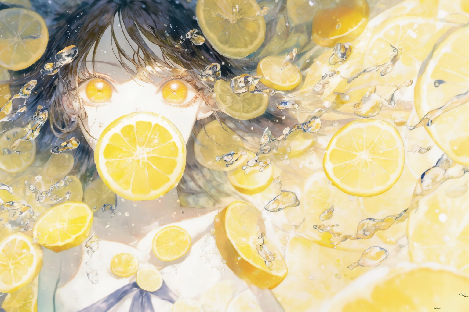 水彩画の女の子の画集画像に各々のフルーツ画像を学習させ、上述のプロンプトを加えて生み出させたi2i画像です。