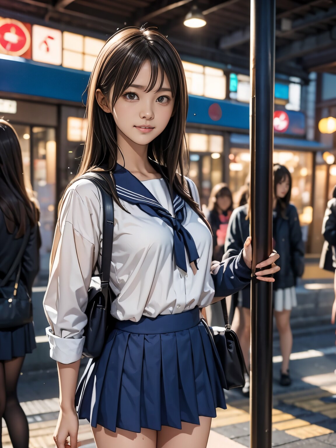 街の雑踏とセーラー服(イラスト風)