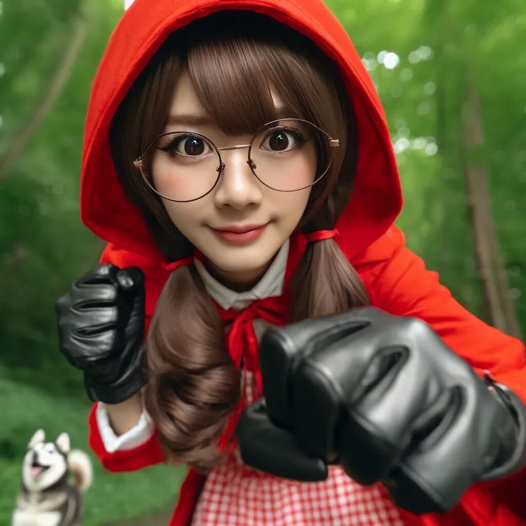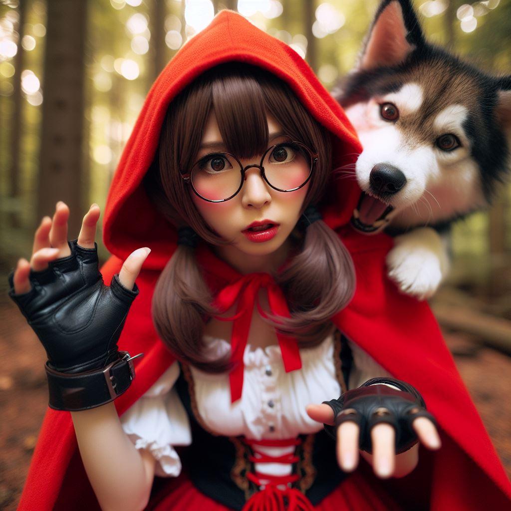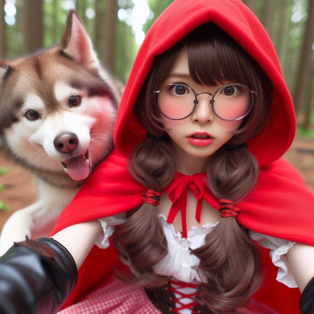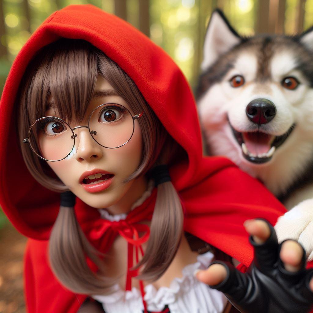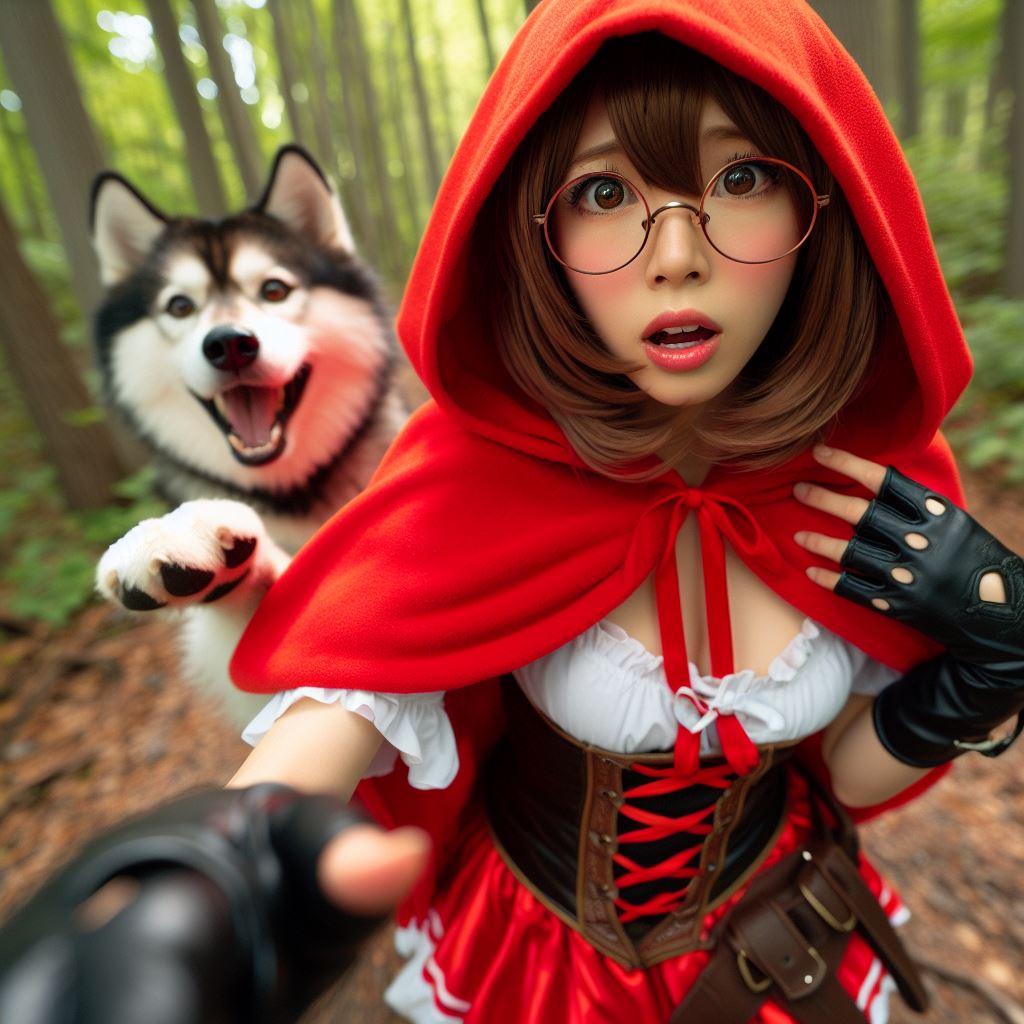 逃げ惑う赤ずきんちゃんを追いかけ回すハスキー