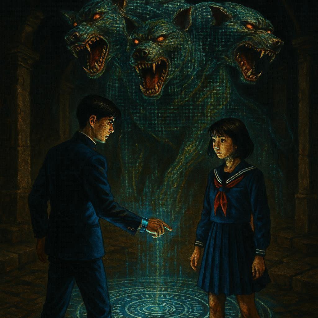 ナムコの 初代女神転生のパッケージアート風にナカジマとユミコ、そしてケルベロス召喚