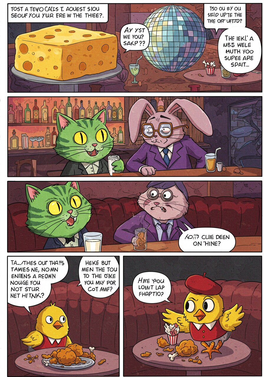 ・豪華なラウンジバーを舞台に、猫(バーテンダー?)、兎(DJ的存在)、ヒヨコ(食されそうな者)が登場。