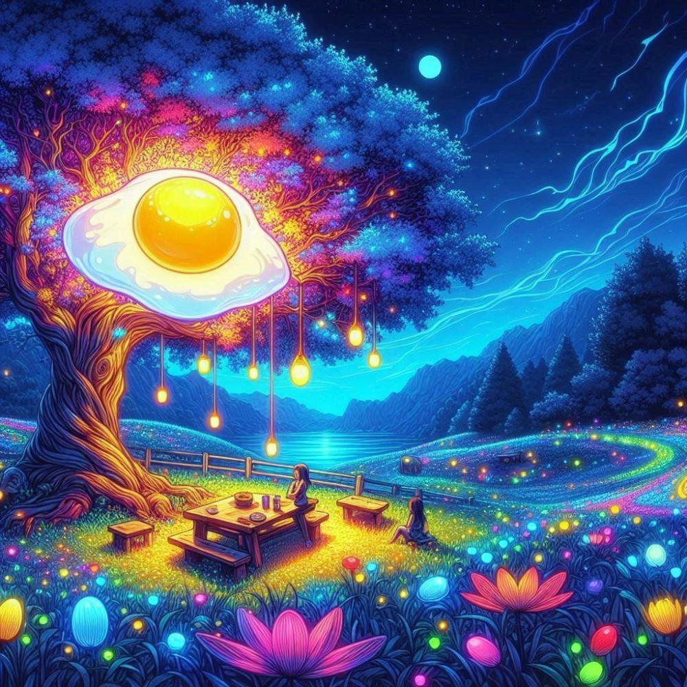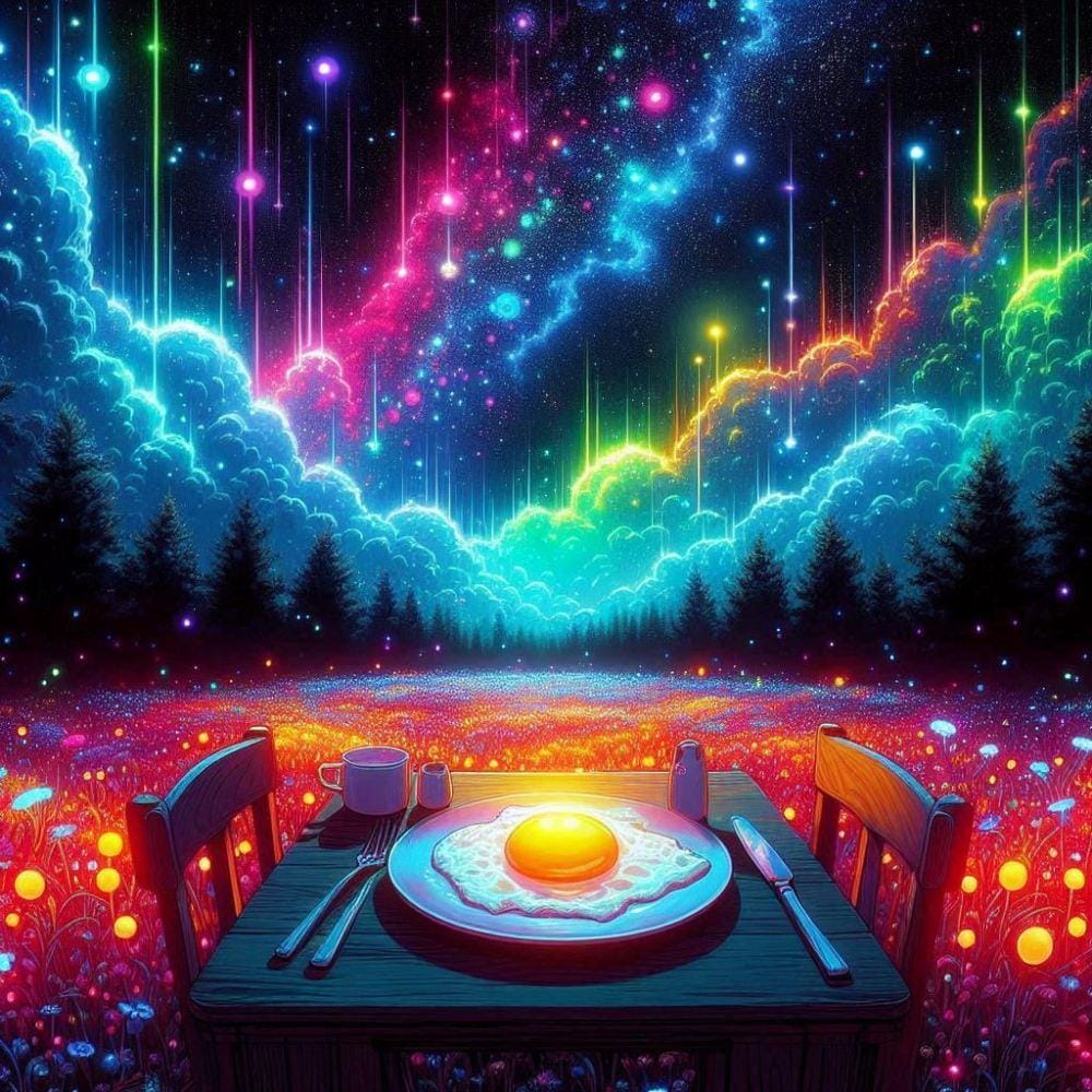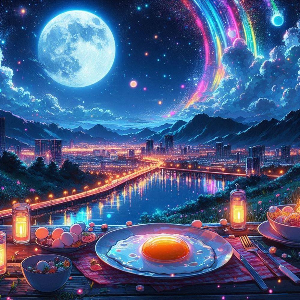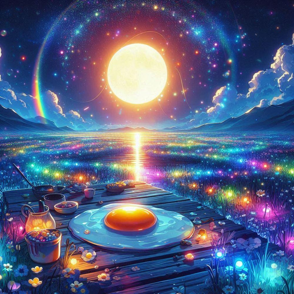 アニメ風、夜空&宇宙虹色発光目玉焼き