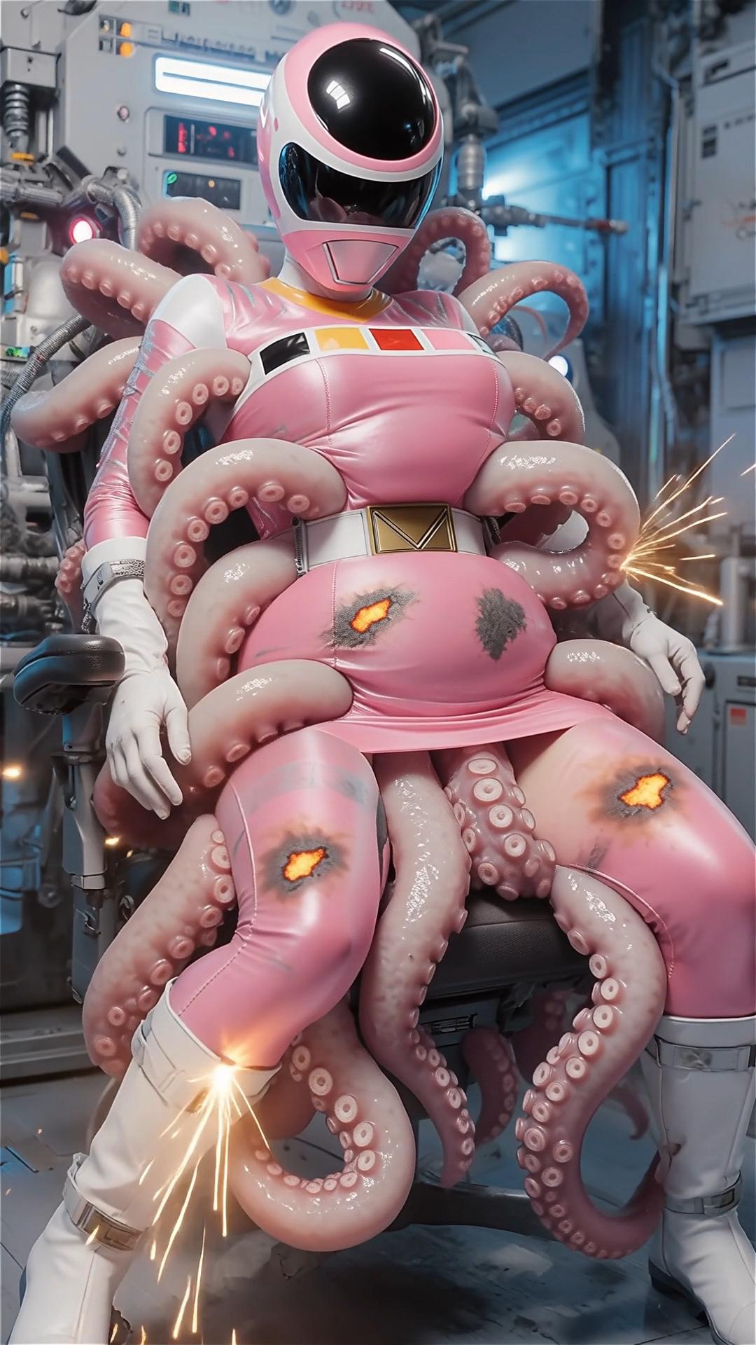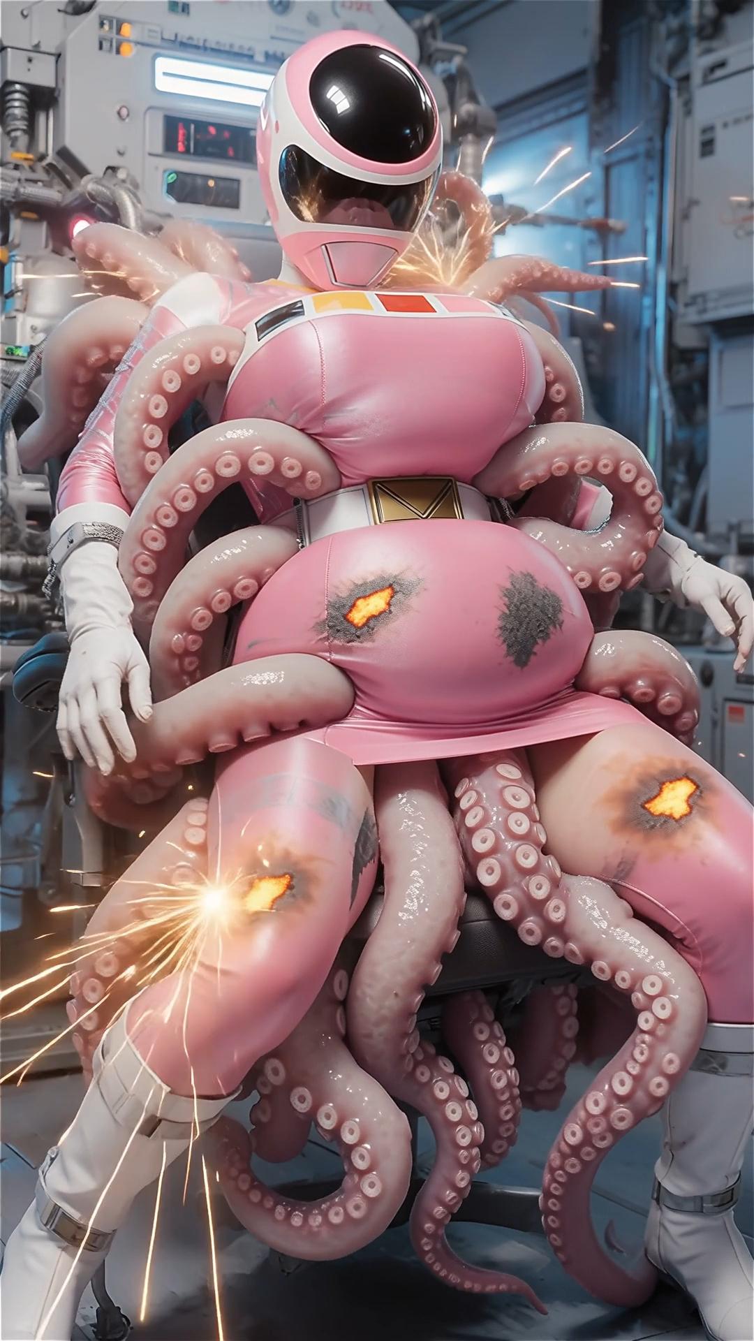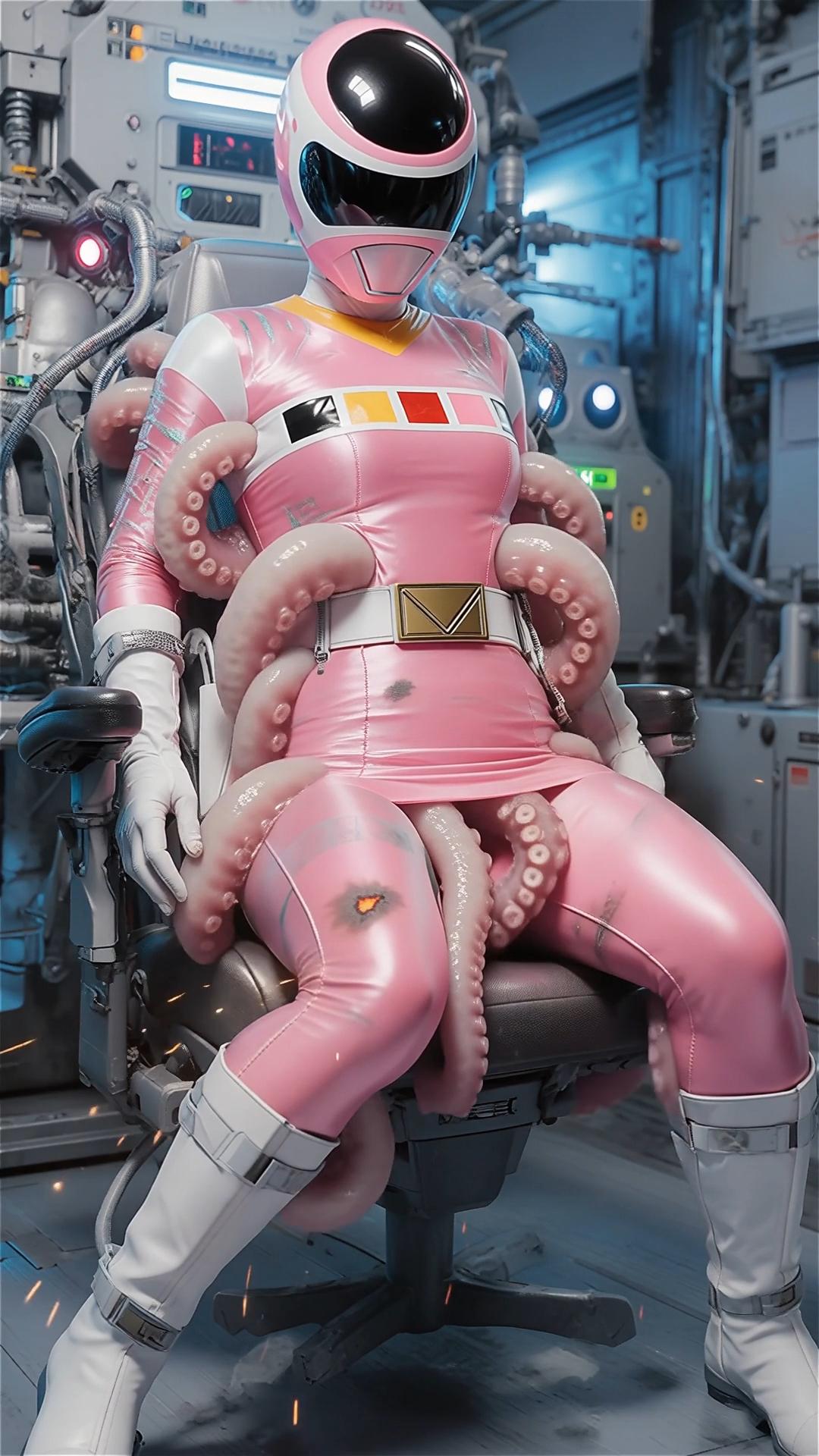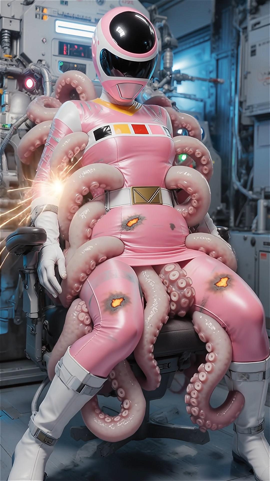 戦士のエネルギーを養分にする生物の実験。早速捕らえた女戦士の養分の溜まったスーツを食させる。一気にスーツの至る所から内部に潜り込む。
