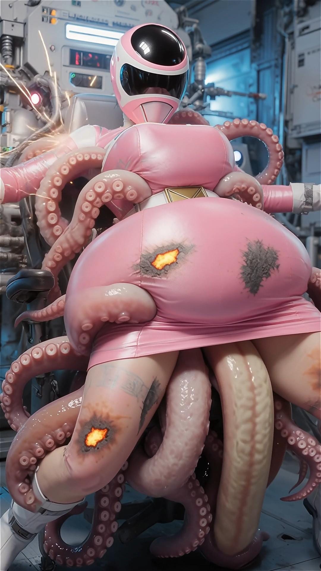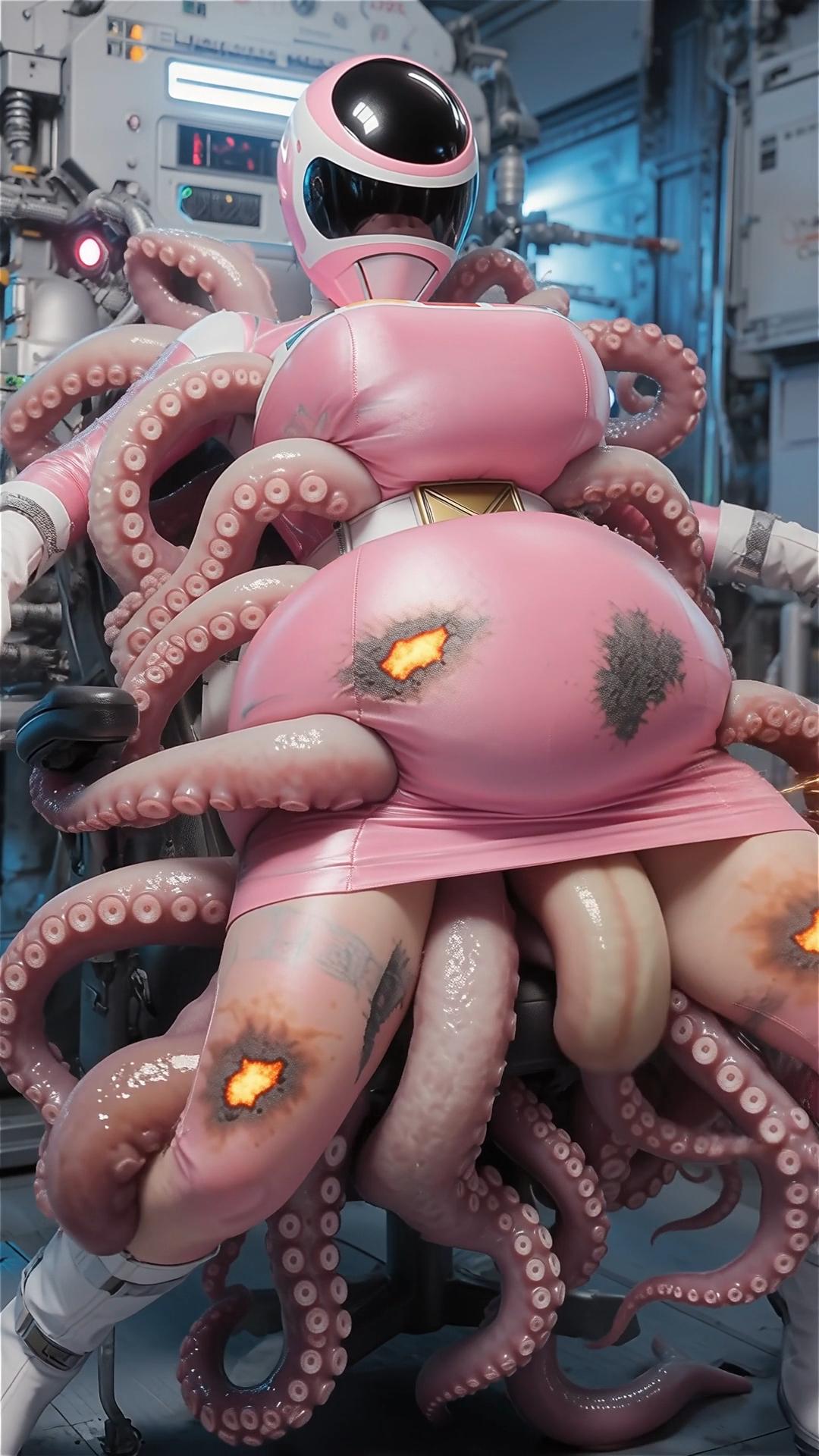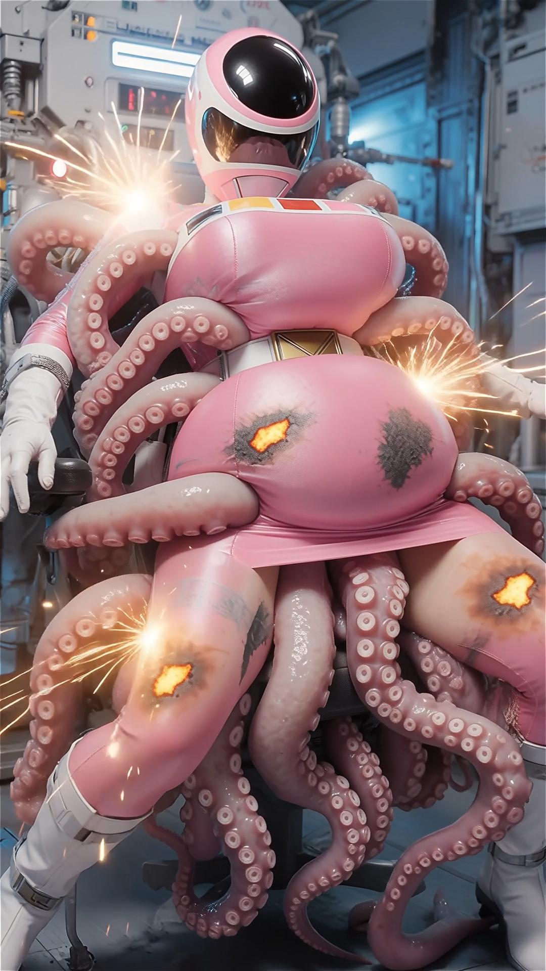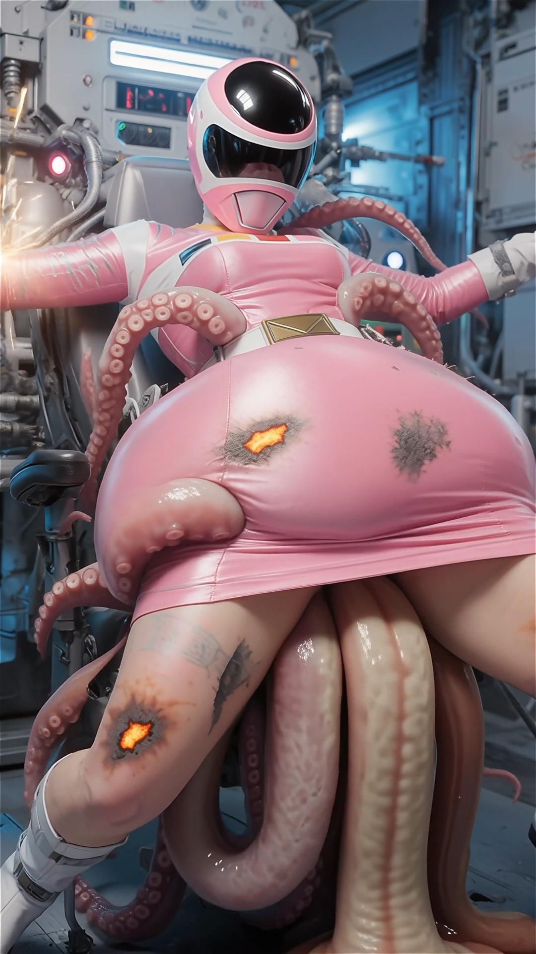 戦士のエネルギーを養分にする生物の実験。早速捕らえた女戦士の養分の溜まったスーツを食させる。一気にスーツの至る所から内部に潜り込む。