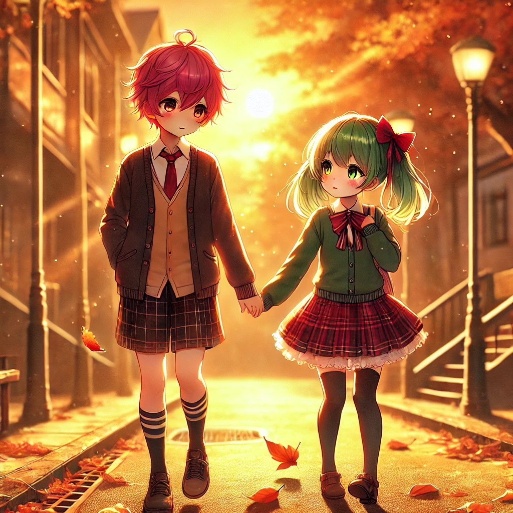 秋の並木道、落ち葉を踏みしめながら歩く二人。ねいは照れながらも手を差し出し、ちよるは嬉しそうに握り返す。夕陽に染まる景色が、二人の距離を優しく包む。