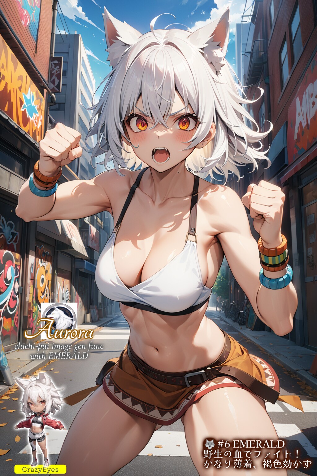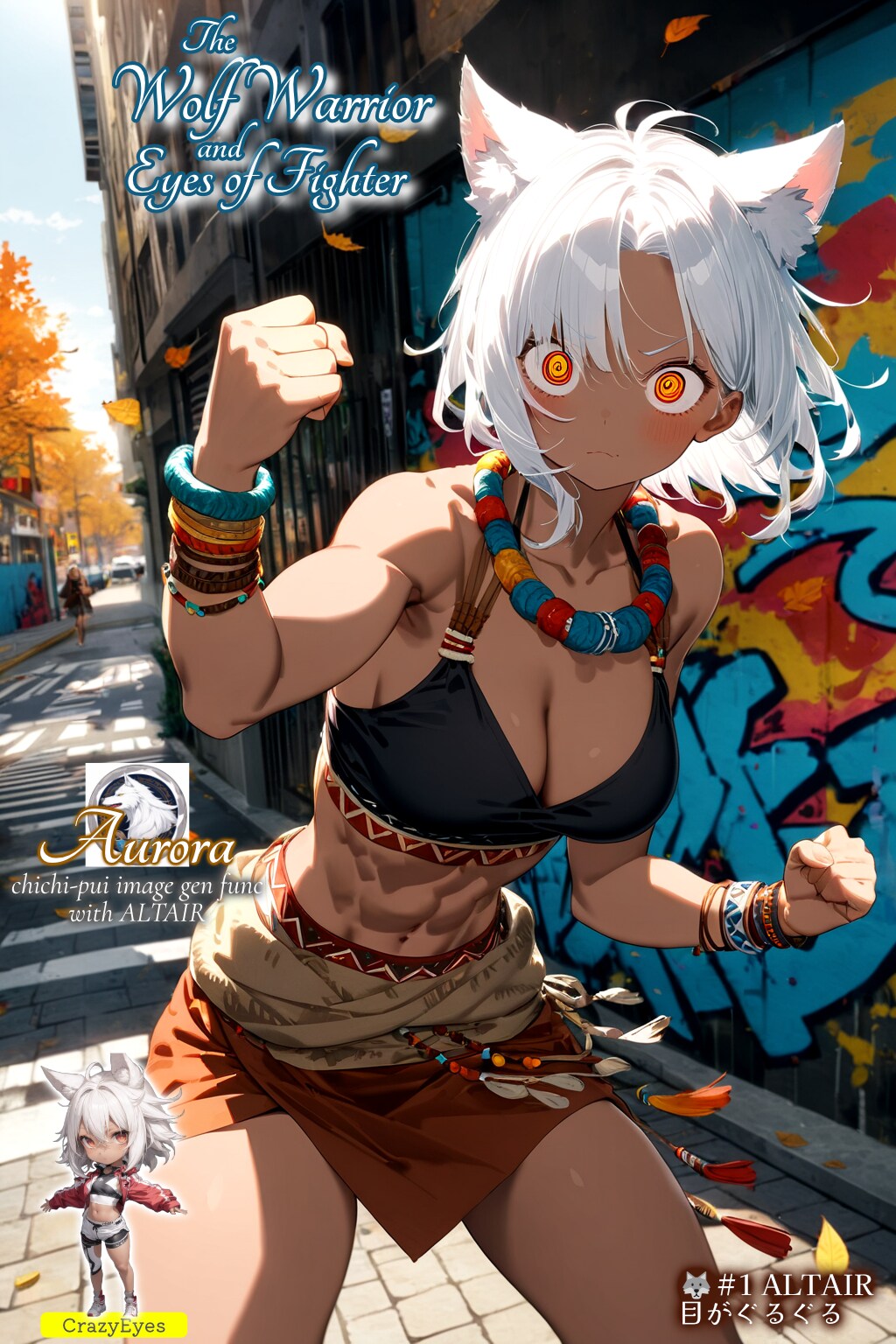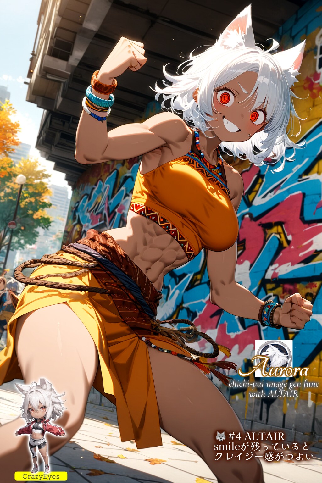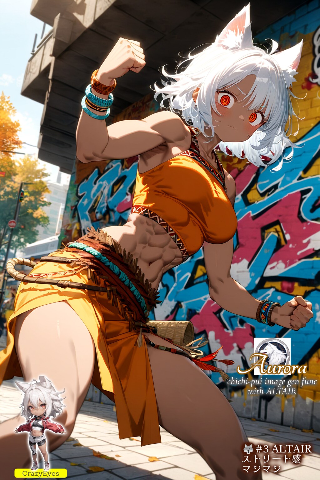 ・キャラクターの方のアウローラは今回の企画の指定通り、目には (crazy eyes:1.2) を強調して常に追加。clenched fist, action pose, dynamic angleで戦っちゃいそうなポーズにして、服装は今回は部族風の tribal fashion を指定しています。