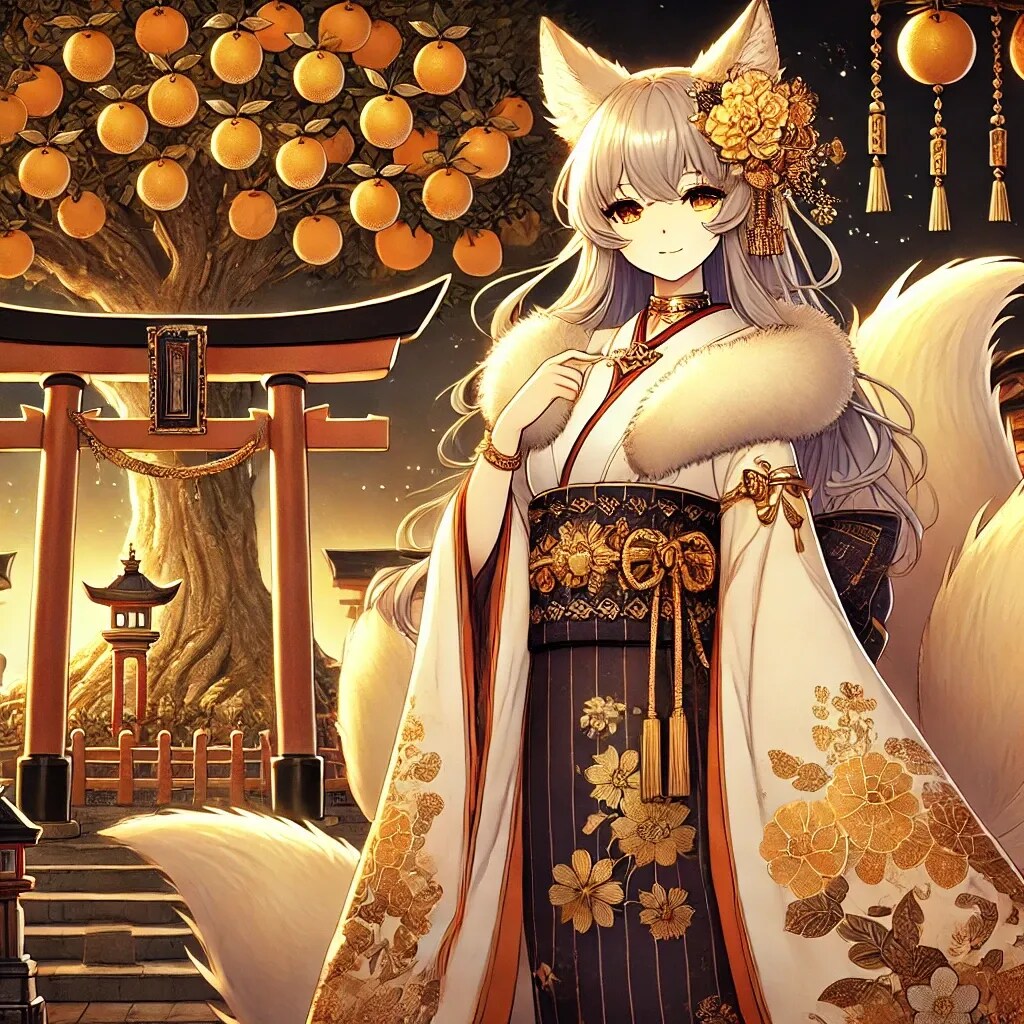 この狐耳の婦人は、まるで 「柑橘の神木を守護する神秘的な存在」 や 「財と繁栄を司る神霊」 のようにも見えますね。💎💛