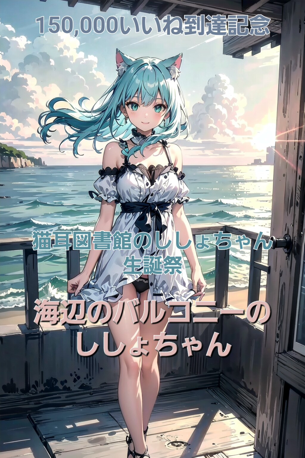 ㊗️150,000いいね到達記念🎉🎊「猫耳図書館のししょちゃん生誕祭」海辺のバルコニーのししょちゃん🐱
