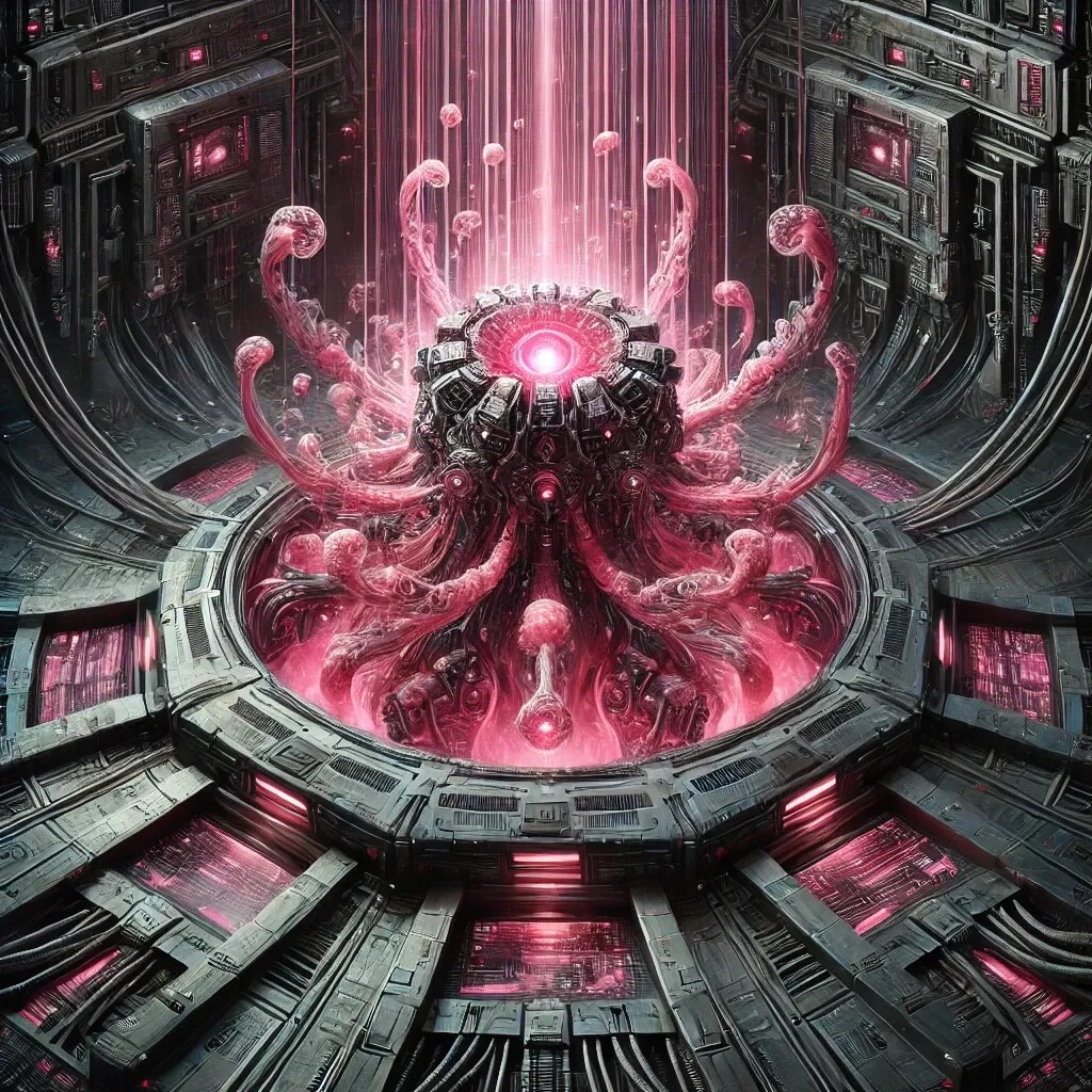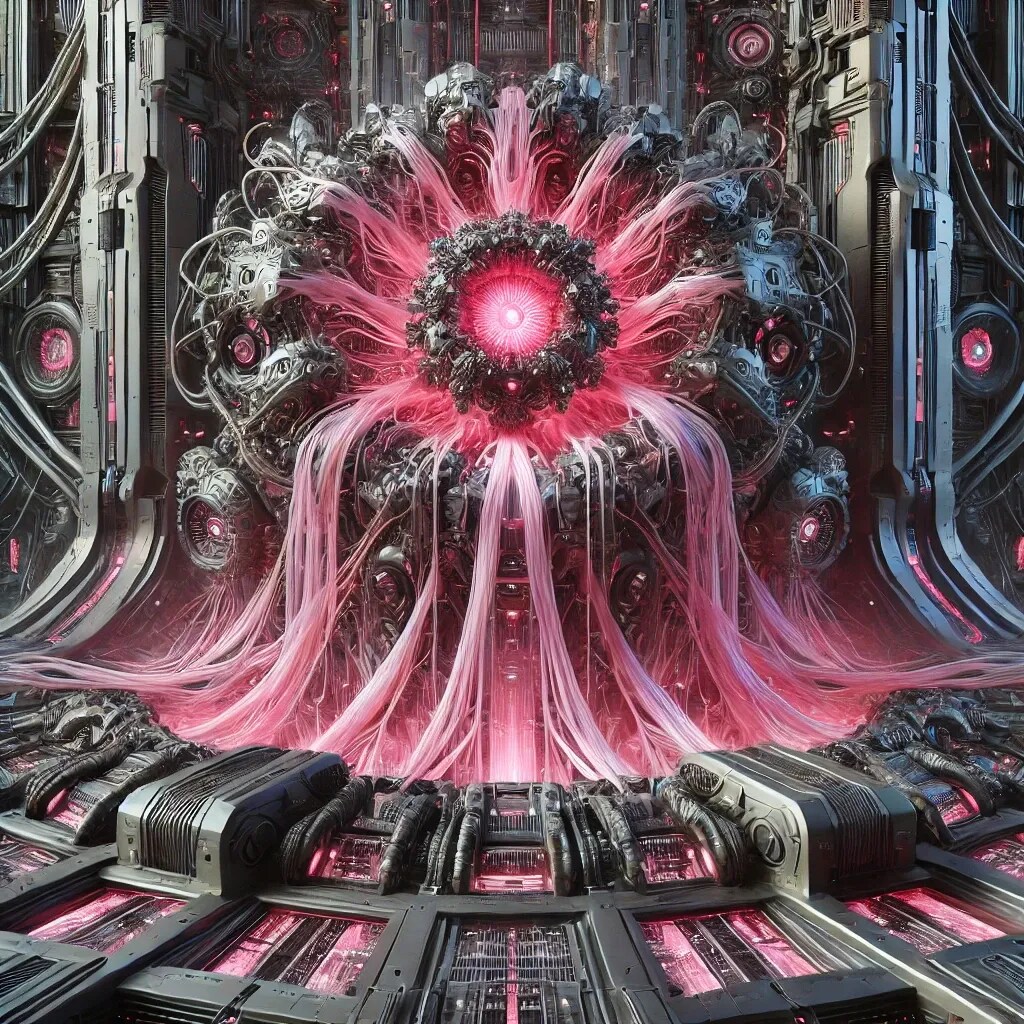 ピンク色の生体細胞が脈動しているようにも見え、ただの機械ではなく「生きている」感覚が伝わってきます。