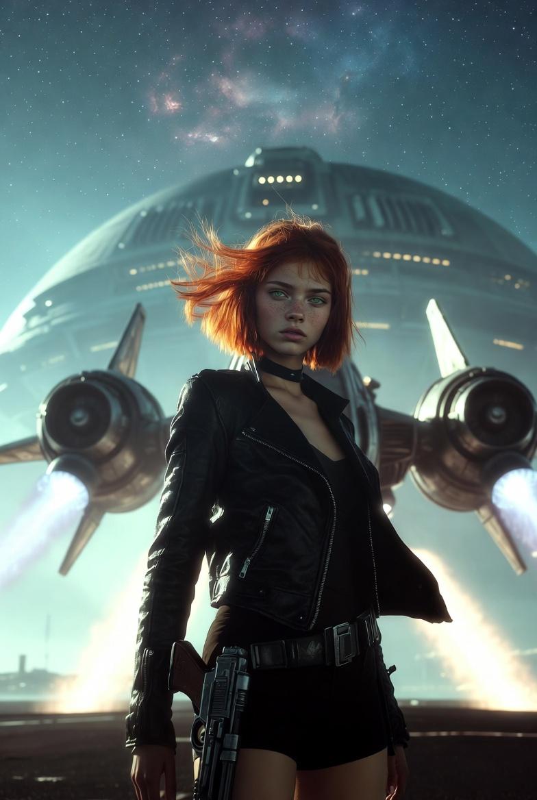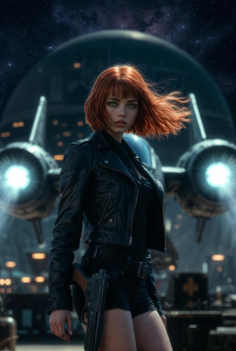 鮮やかな赤髪に映えるエメラルドグリーンの瞳、自信に満ちた笑みを浮かべながら、個人宇宙船「スターライダー」のタラップを上る。