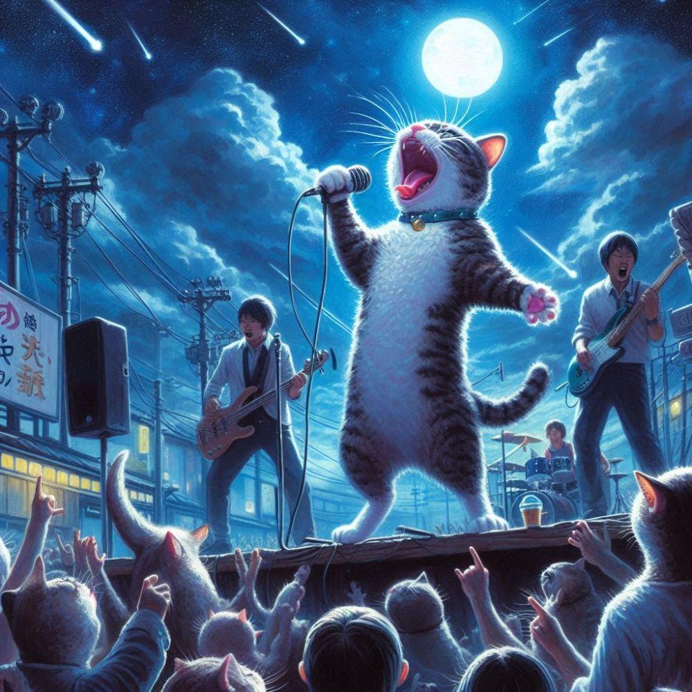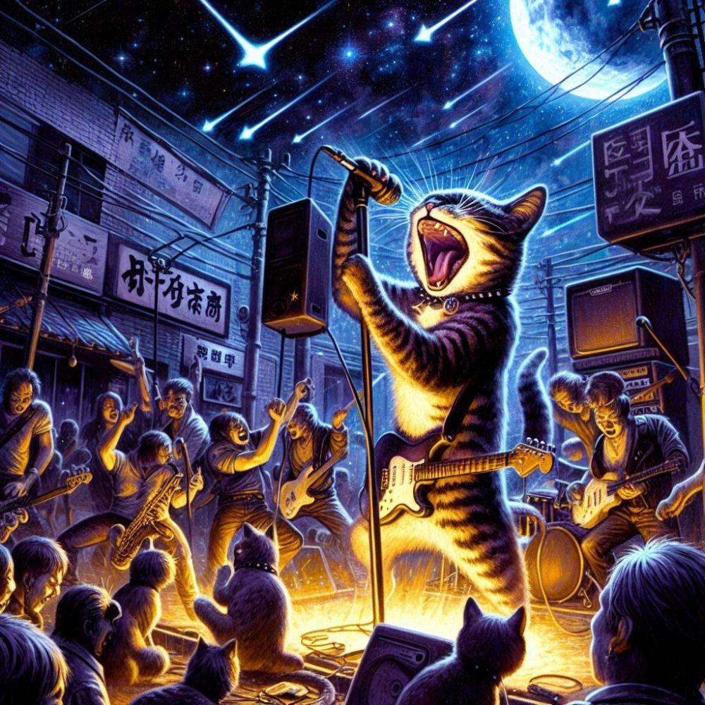 アクリル風 地元の川崎駅前で路上ライブをするロックバンドボーカル猫
