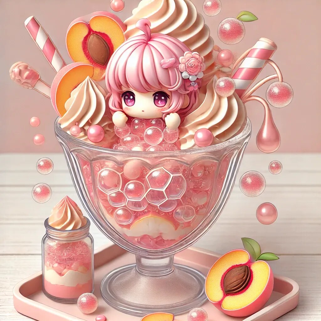桃のパフェの甘さと、「ももほうちゃん」の可愛らしさが融合して、とてもキュートで楽しげな仕上がりになっていますね。😊🍨