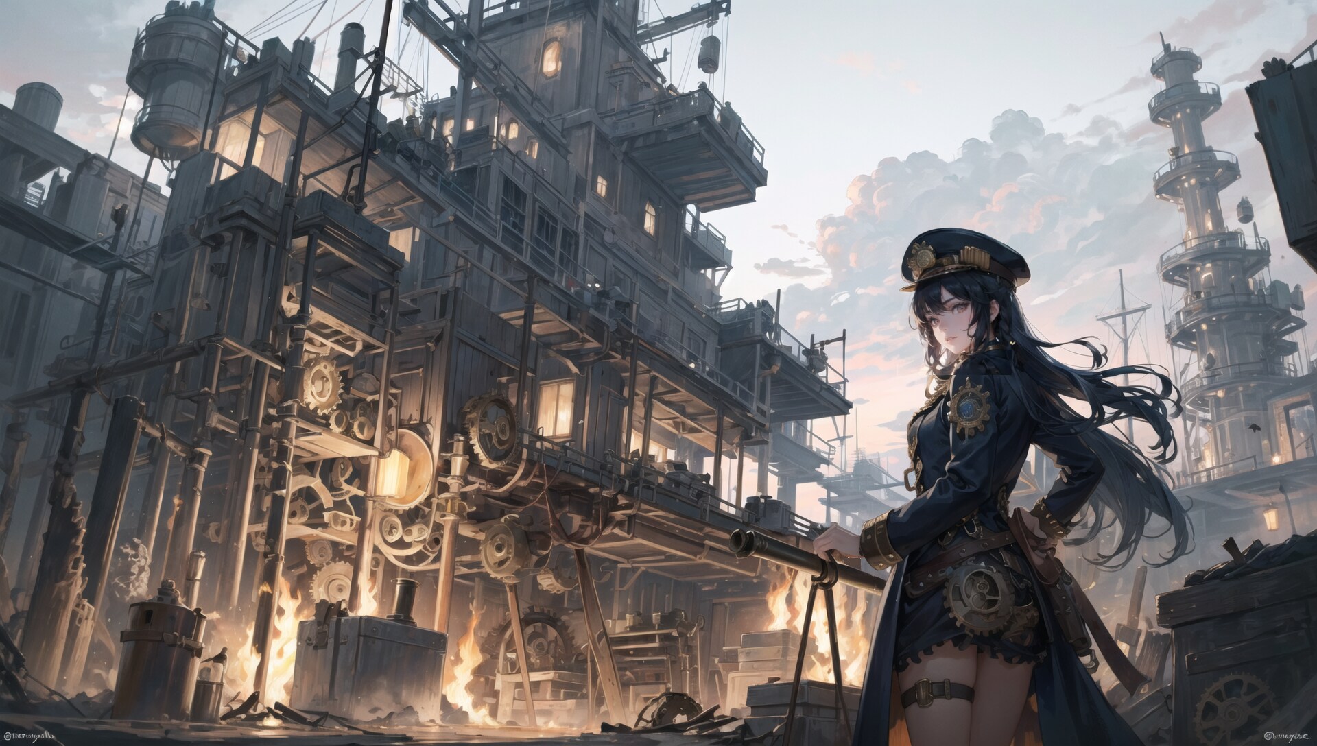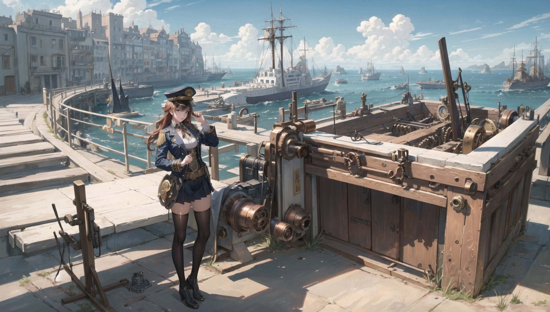 スチーム船が立ち寄るドックと、船の修理を待つ女船長です。