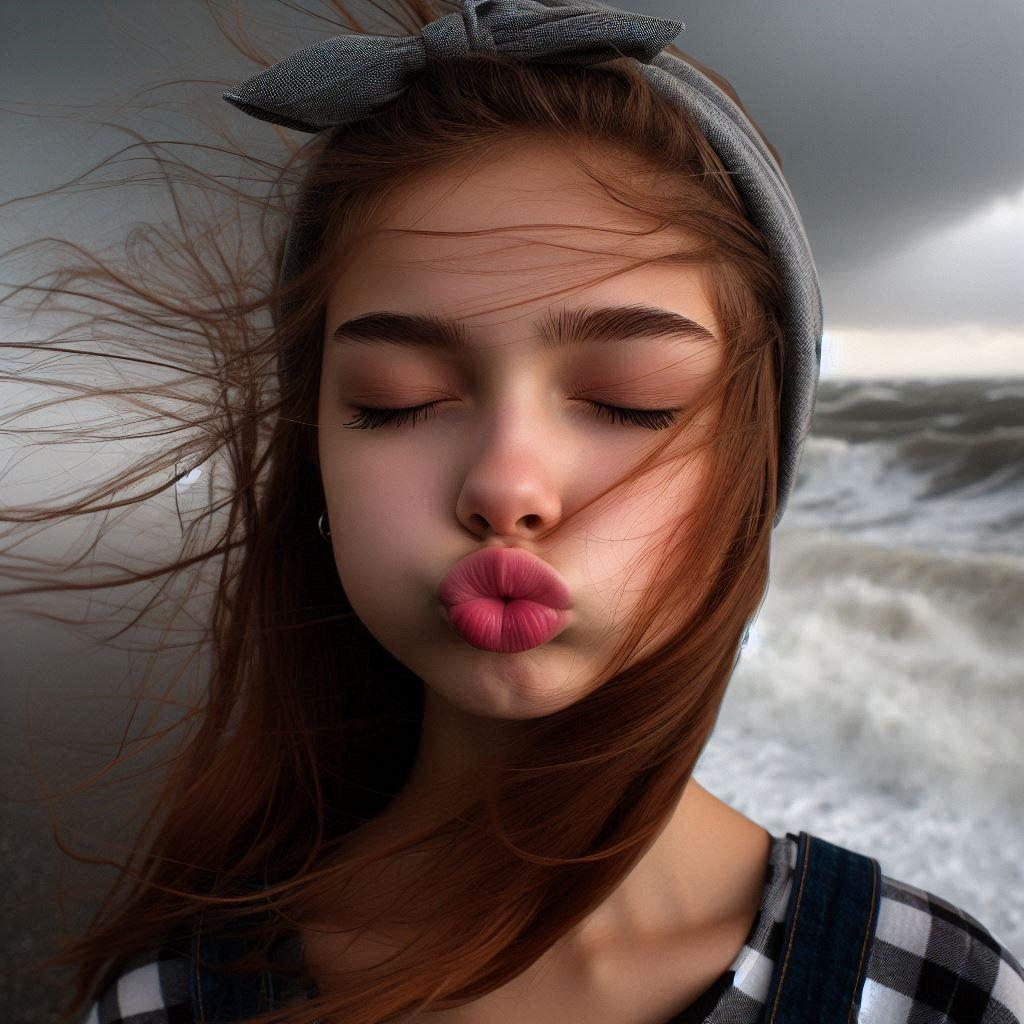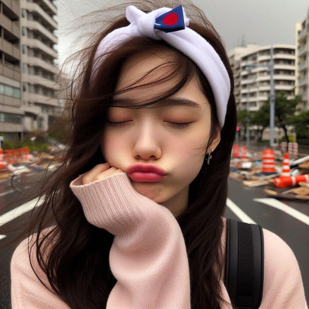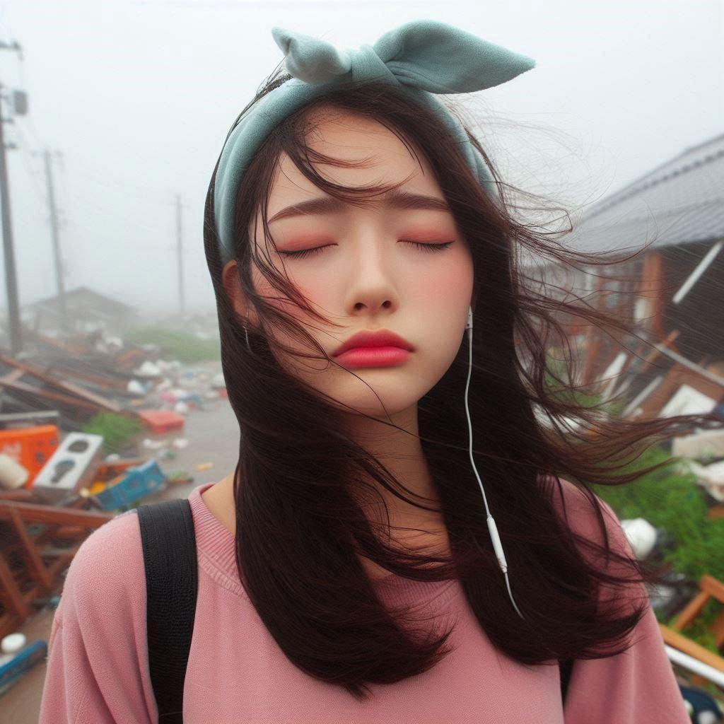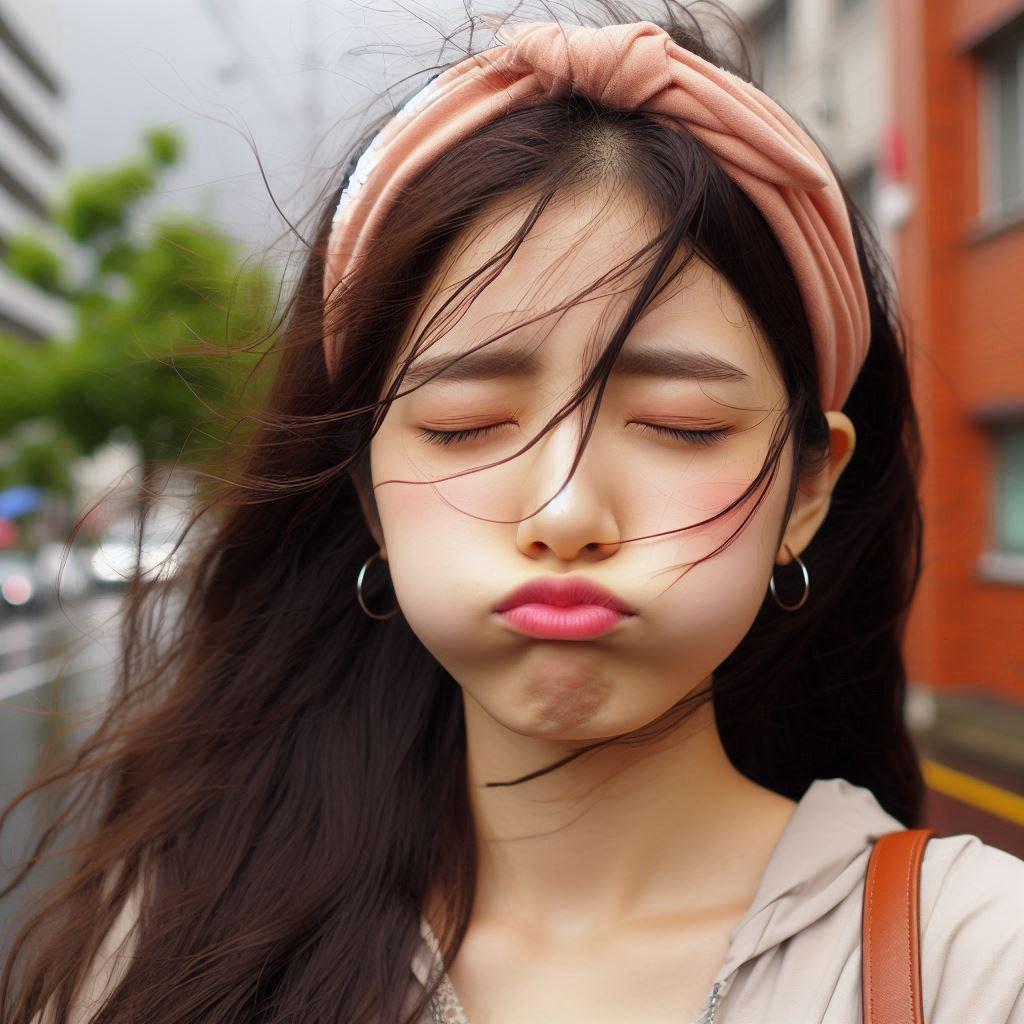 目を閉じて口をすぼめた17歳◯◯国女の子(台風の中)(カチューシャしている)