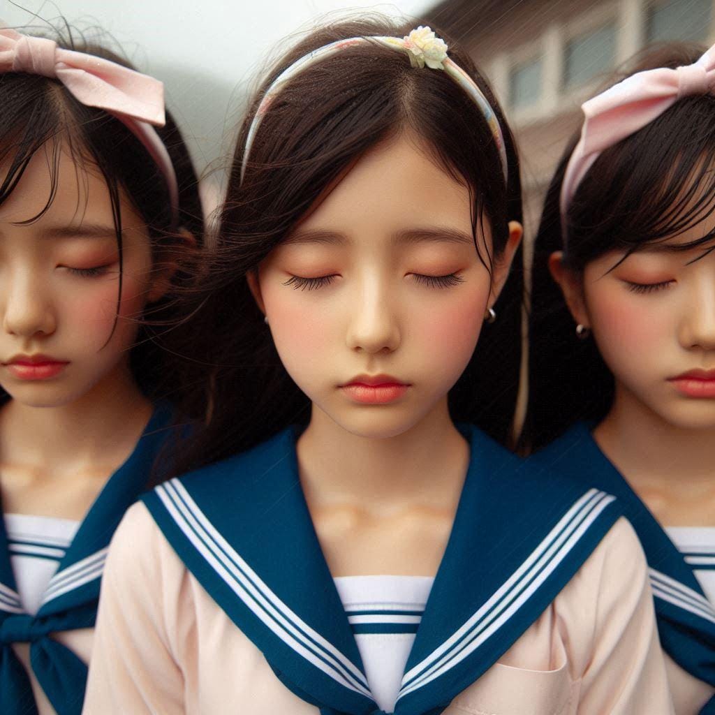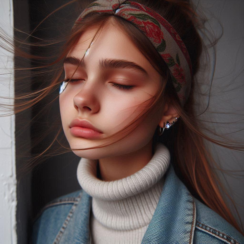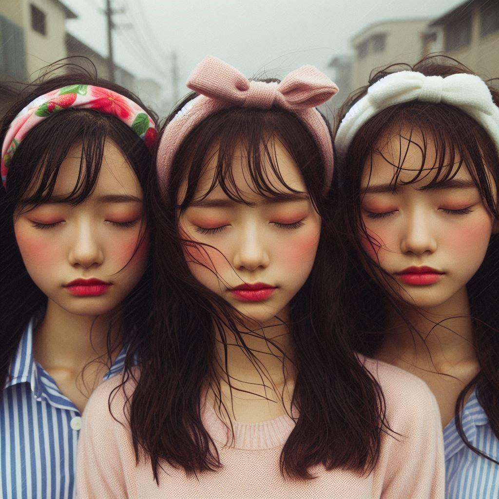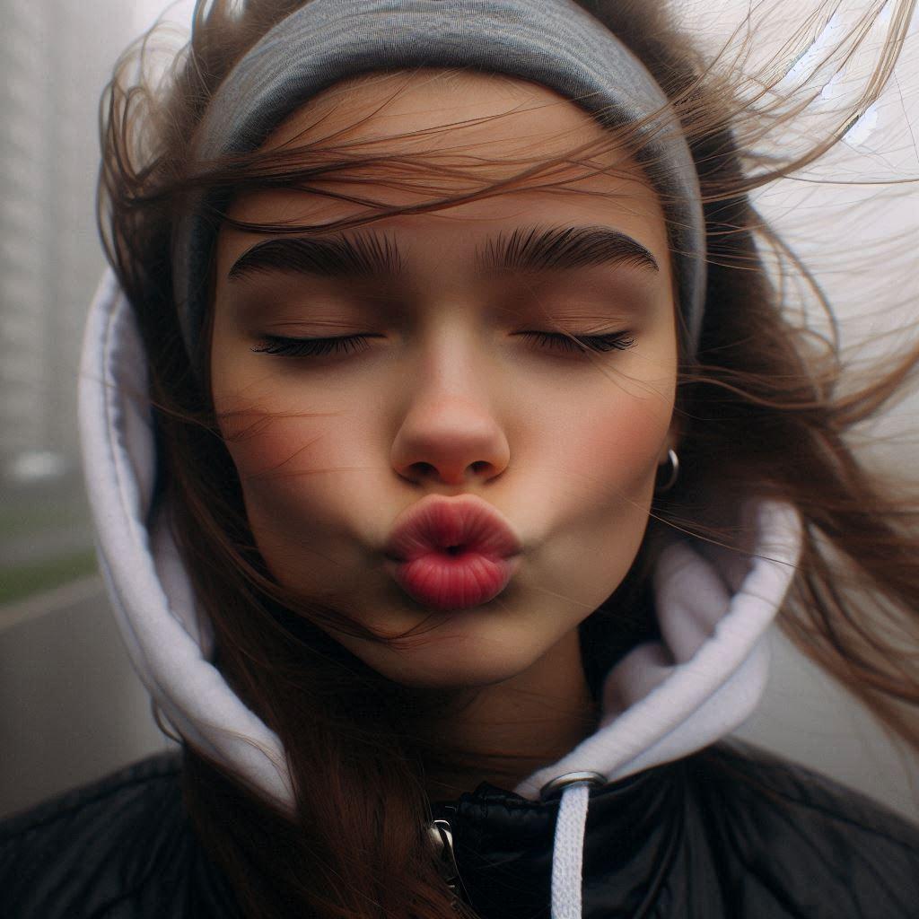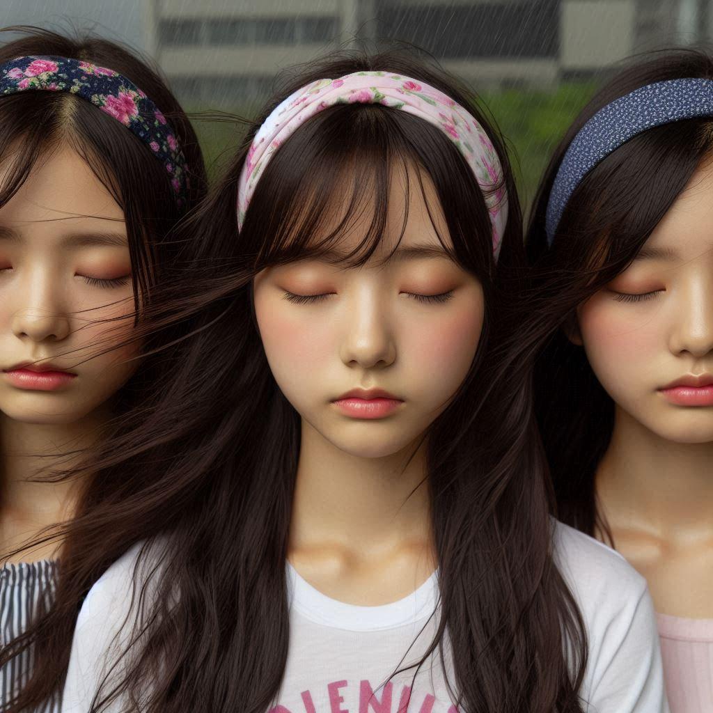 目を閉じて口をすぼめた17歳◯◯国女の子(台風の中)(カチューシャしている)