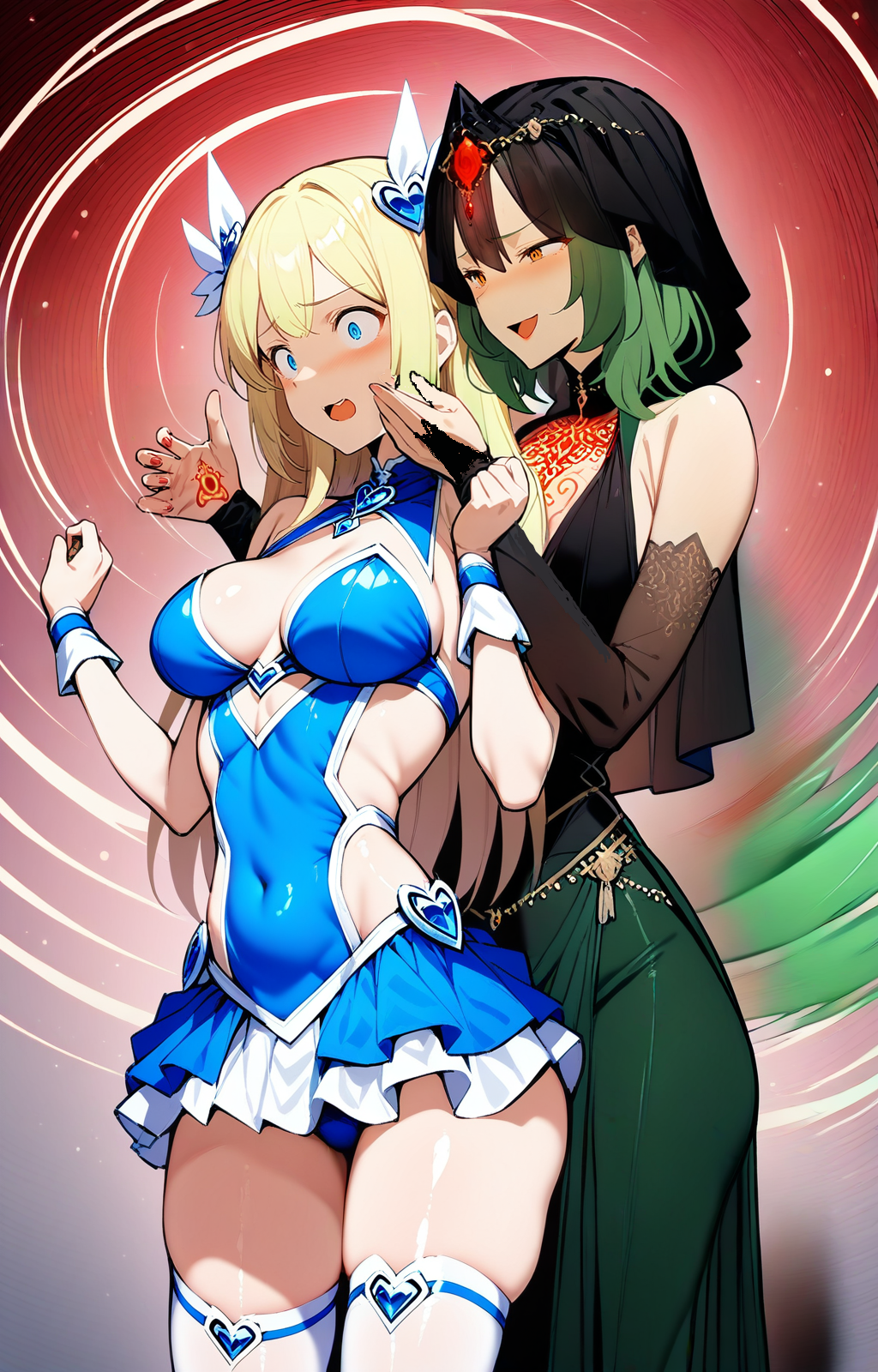 魔女が背後に回り込み、両手が私の頭の左右に近づく。そこから低く唸るような魔力の音が耳を打ち、頭蓋の奥まで浸透してくる。視界がぼやけ、脳に靄がかかったように、思考があいまいになっていく。「抗うな。貴女の心はもう私のものよ」と、彼女の声が脳内に響き渡る。甘く毒々しいその命令に抗おうとするけれど、言葉にならない叫びが吐息となって漏れるだけ。自我が溶け出し、深い闇に沈んでいく感覚に恐怖が募る。私は私でなくなる――そんな予感が、胸を締め付けた。