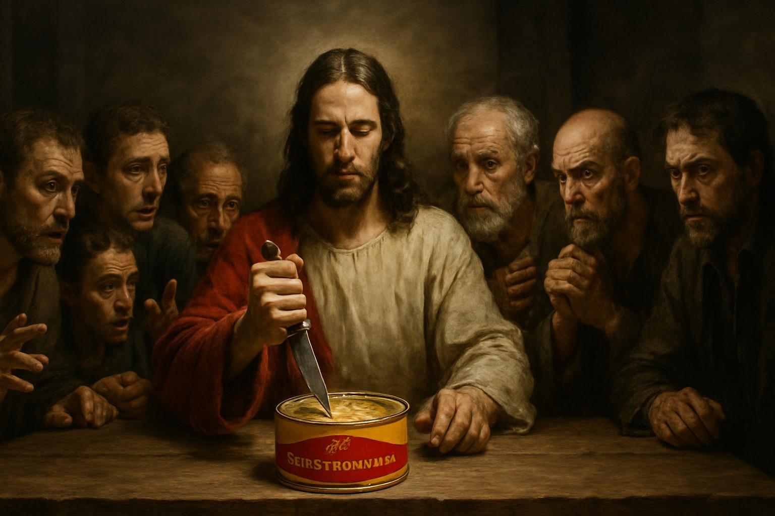 イエス・キリストはテーブルの中央に座り、シュールストレミングの缶詰に軍用ナイフを突き立てようとしている。