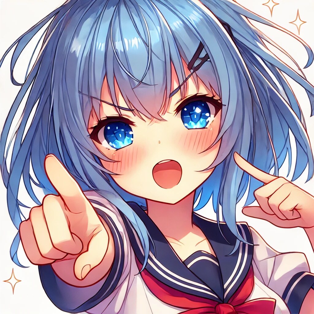 カメラに向かって指を突きつけ、ツンデレ全開の「勘違いしないでよ!」と言わんばかりの表情を見せるボブ子ちゃん。青い目がきらめき、頬は赤く染まっている。制服姿が彼女の可愛らしさをさらに引き立てている。