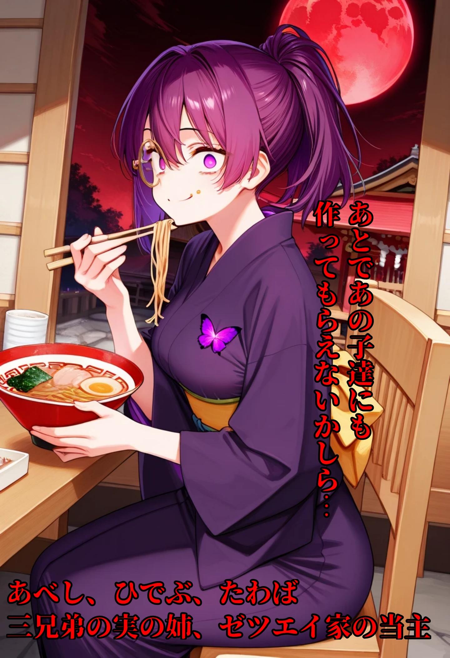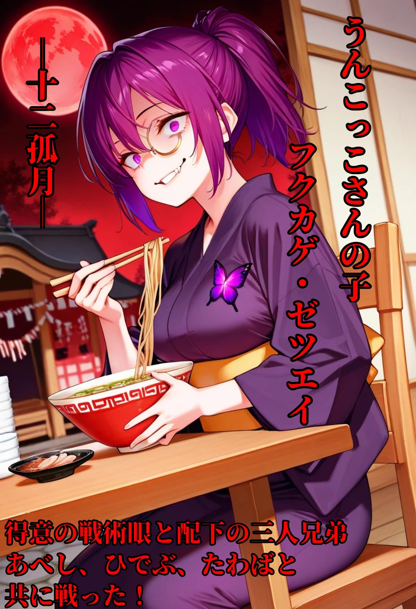 侍冬地戦にて登場、侍冬地戦キツツキ軍にて現れた参謀、家族にあべし、ひでぶ、たわばの三兄弟がいて、彼らの長女をやっている。幼い頃から厳しい環境下で育ってきた彼らを救ったのがノグロウであり、アウトローにはアウトローなりのストーリーがあって、今ではキツツキ家ー十二孤月ーの一柱として、マタタビヤ地方の治世や汚れ仕事などに貢献している。