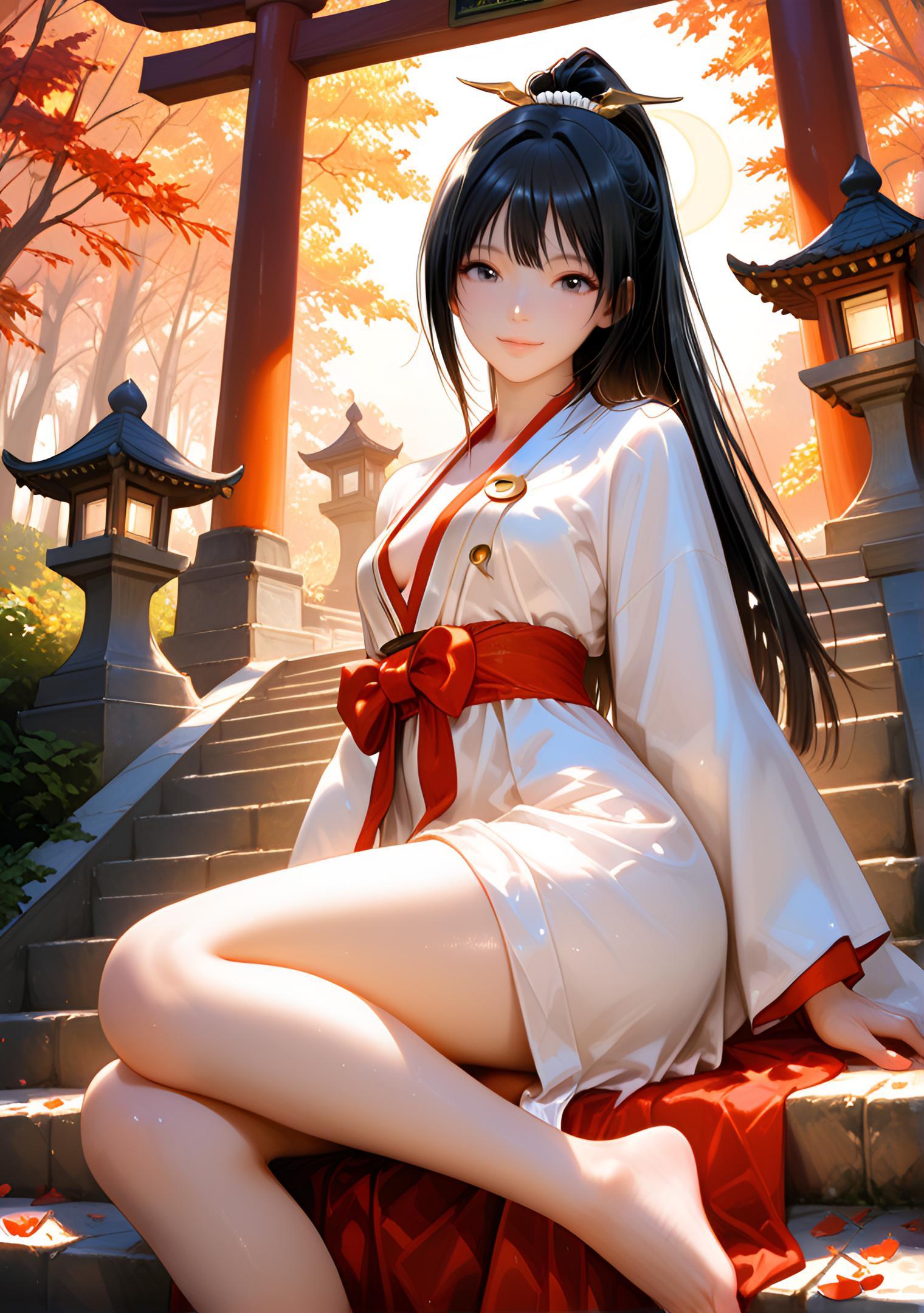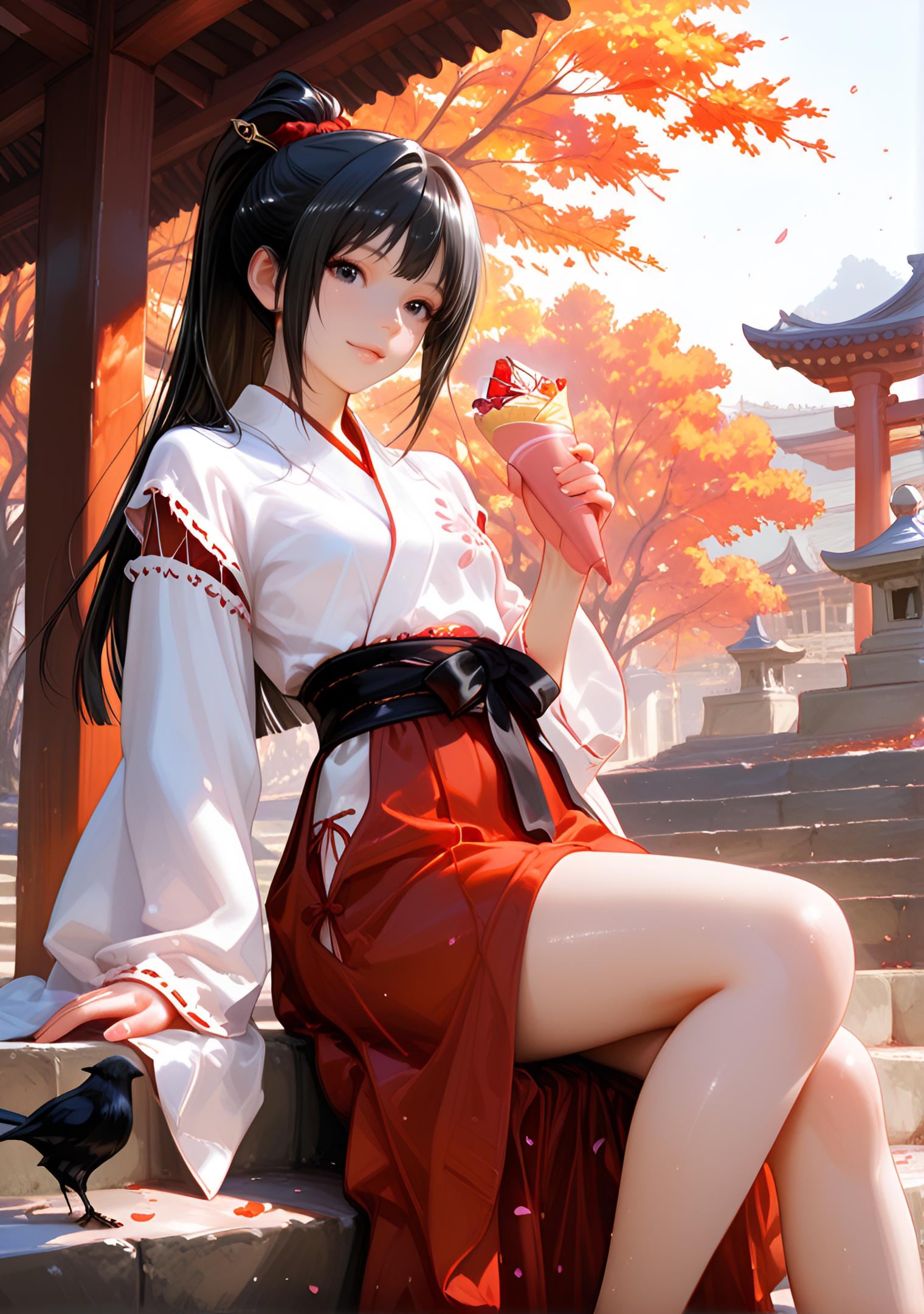 - classic white and crimson miko outfit with glossy silk texture, wide flowing sleeves, red pleated hakama, gold-accented obi, wooden hair ornament with red tassels # 紅白正統巫女衣