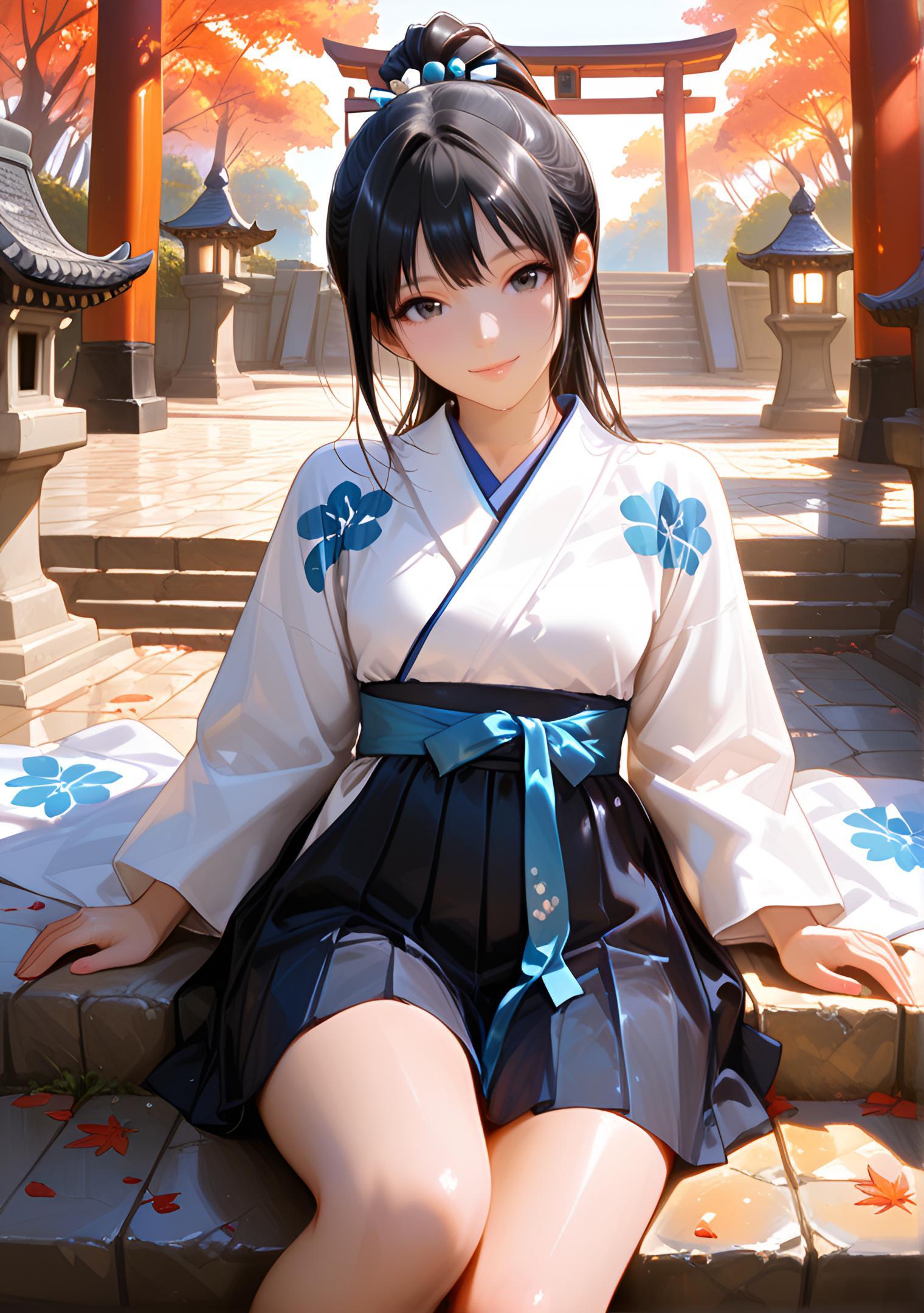 - white kimono with sky-blue accents, fluttering long sleeves, layered pleated skirt, small blue beads and silk ribbons on hair ornament # 空祈の巫女衣