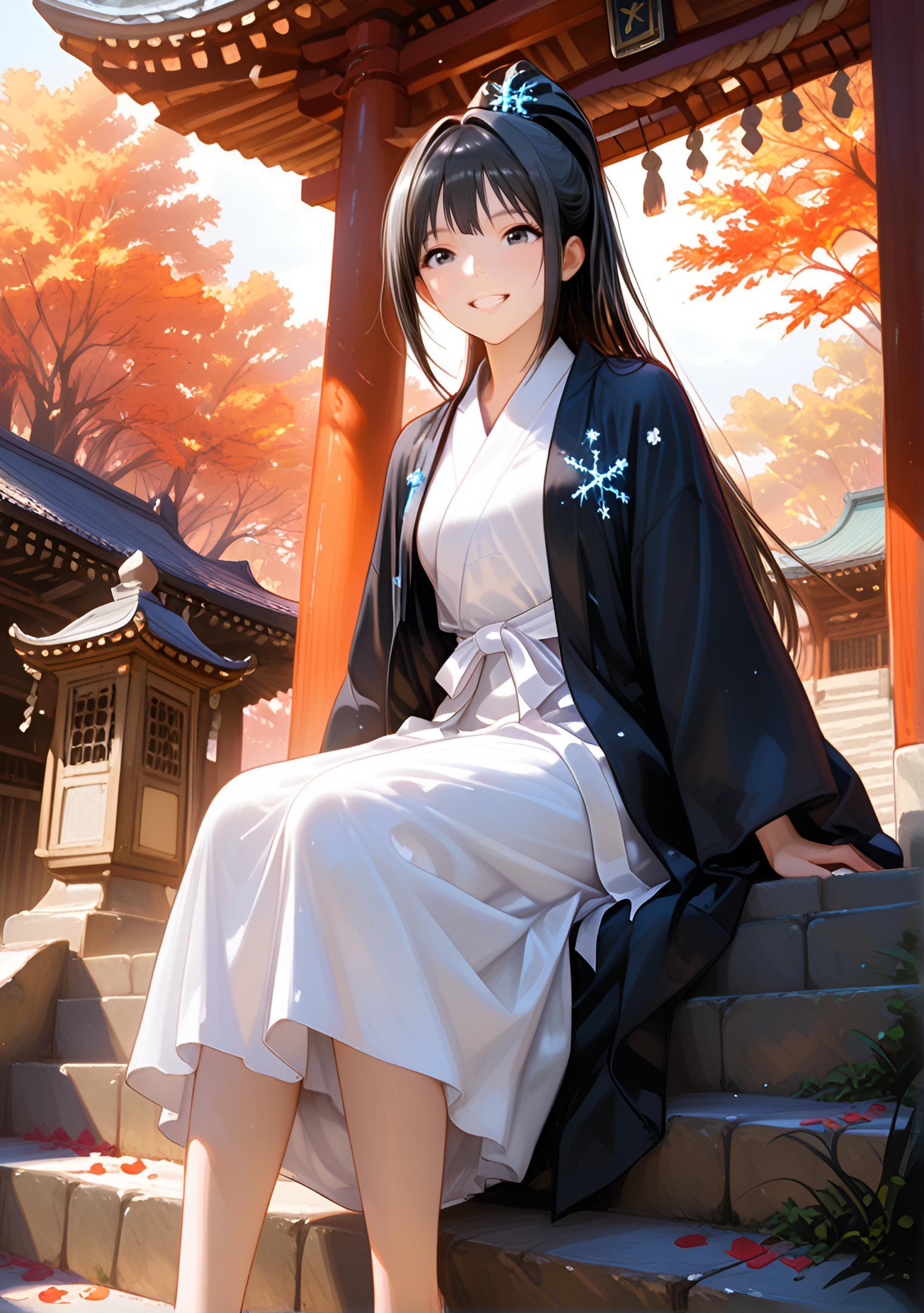 - pale icy-blue and white satin miko robes, delicate gradient on sleeves, snowflake embroidery, crystal hairpin and transparent ribbon, serene and cool # 氷華の巫女衣