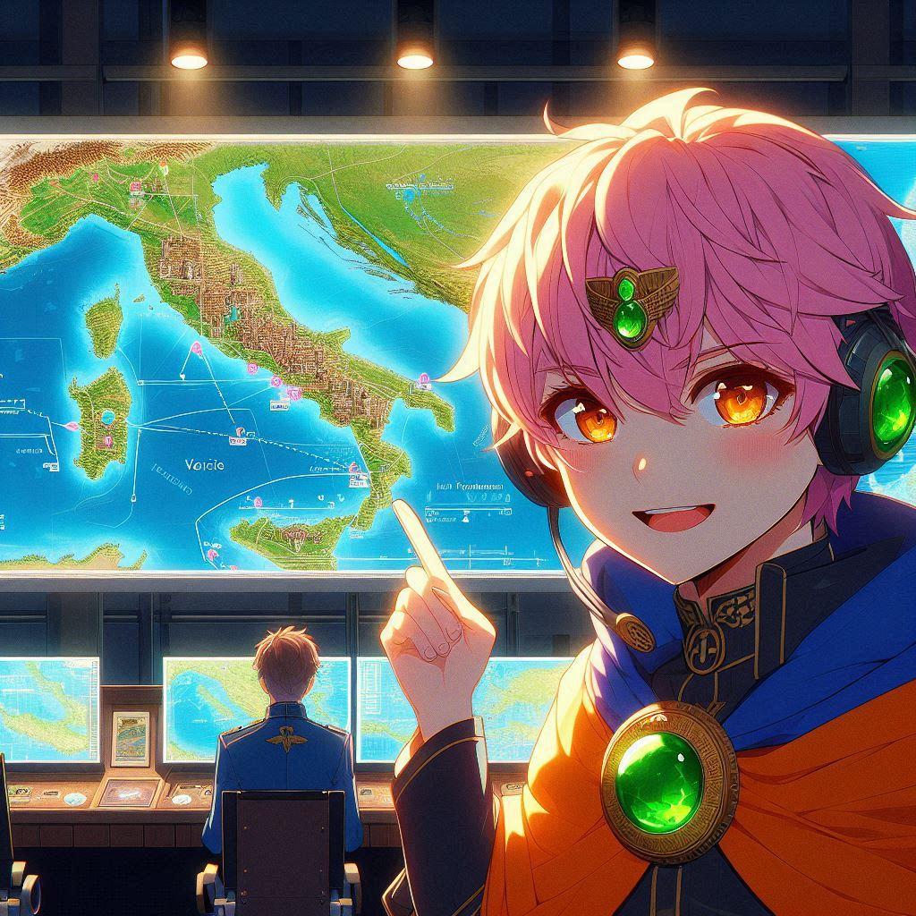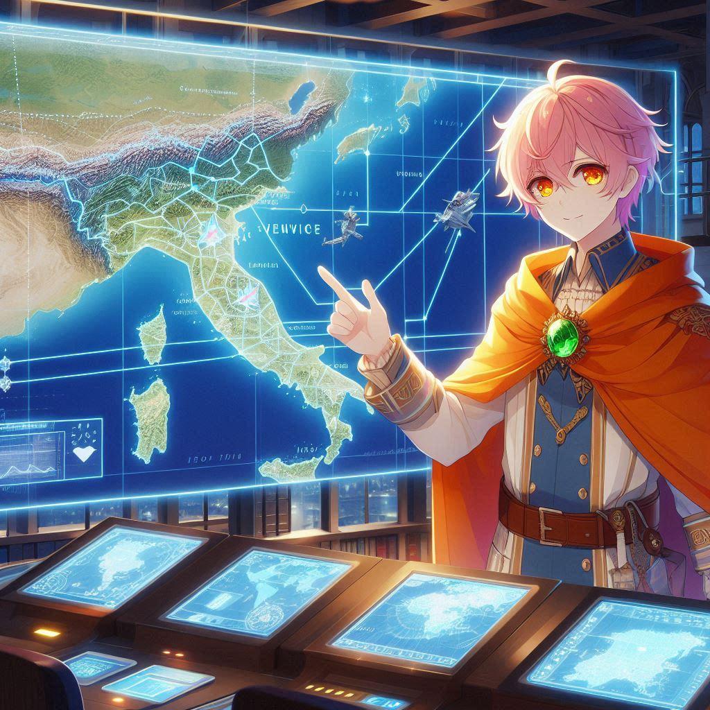 カラカラに設けた司令所で、集った仲間に説明するアッシュ。空間に投影されるのは、長靴半島周辺の地図。
