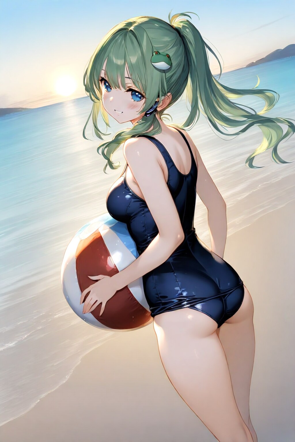 ビーチのスクール水着早苗