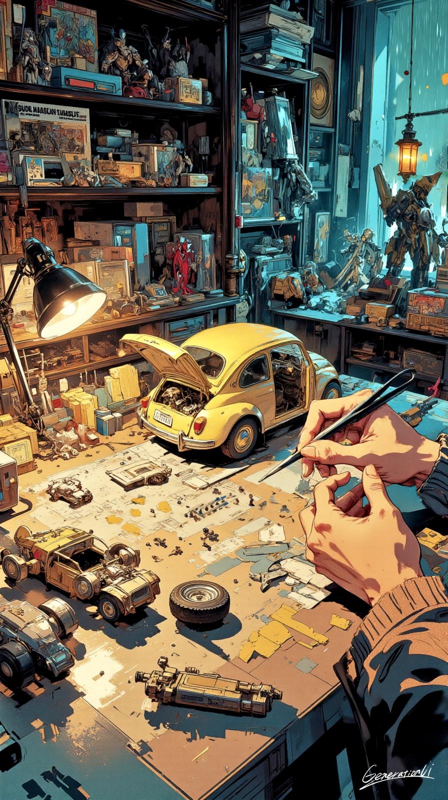 作業台の上には、途中まで組み立てられた黄色いビートルと、ばらばらになった小さなパーツたち。手は忙しく動いているけれど、心は穏やか。