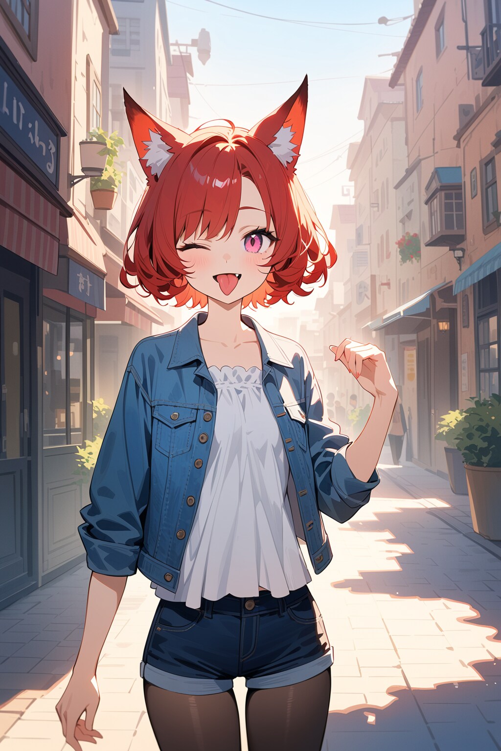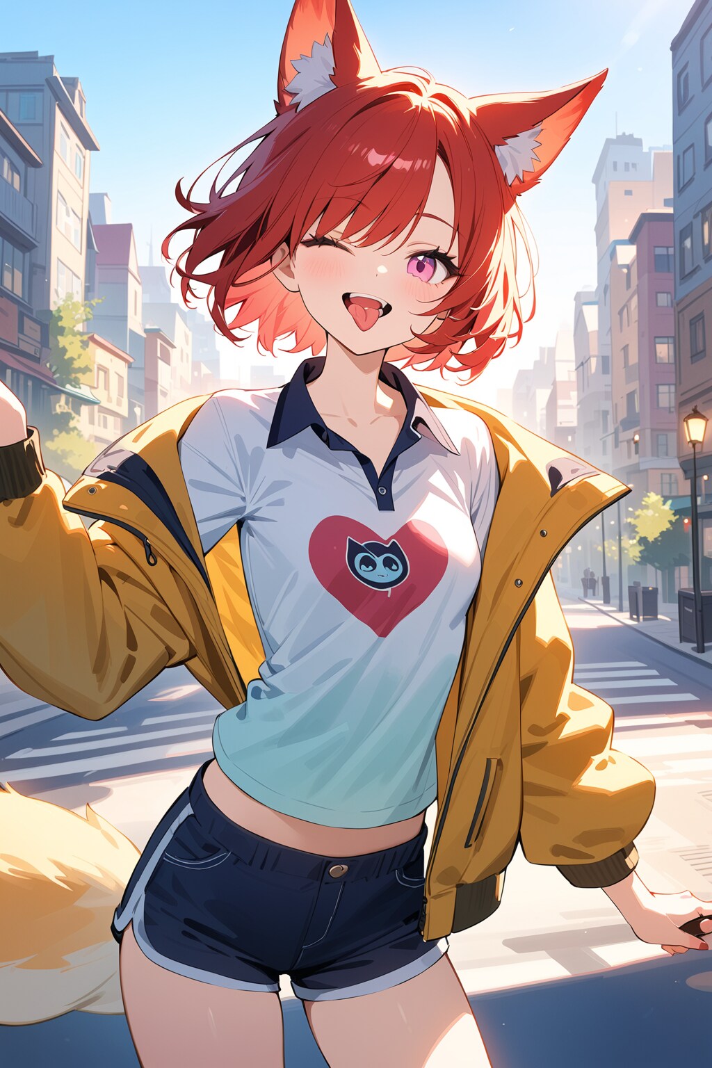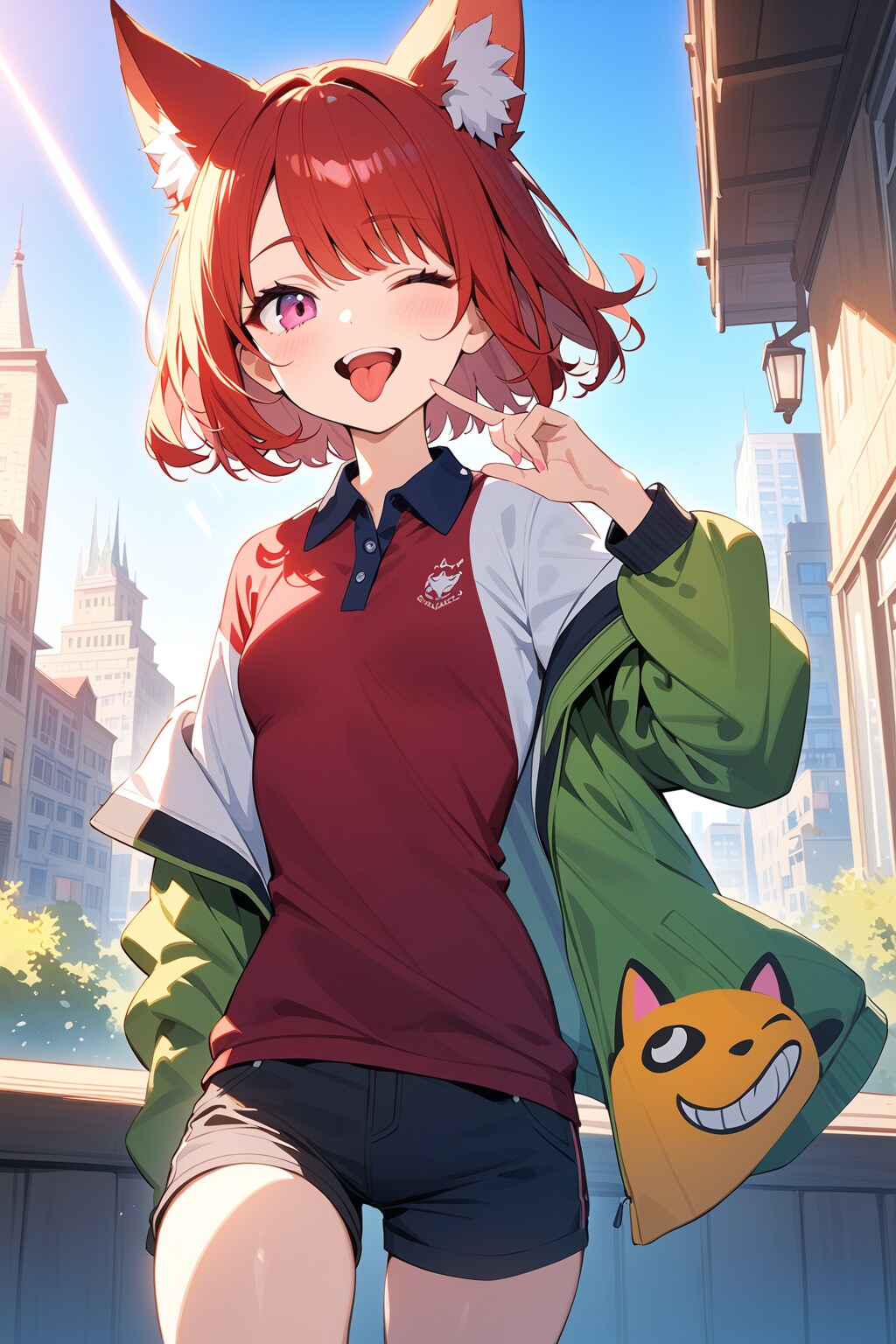 ・サンプルプロンプト通り、open mouth, only one eye is open, smile, stick out tongue, を追加、blushは外して実現しています。