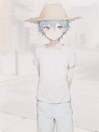 5. 4を原資に Image to Image を実行して生成された画像(原画の生成で使用したプロンプトと同じものを使用・3度目).よさげなものが3枚生成された.1枚は変なところから手が生えてきたのでさよならしました.さよならした彼もイイところがあったのだけれど、そこから手が生えちゃいかんでしょうという仕上がりだったので、まあ、今回はご縁がなかったということで.背景もあまり出ておらず、線もいい感じに残っているこの彼を最終成果物としました.服のストライプもほとんど出ていないし、なんだかとても幼くなってしまったけれど、まあ、これはこれで良い.そして好き.女の子に見えなくないけれど骨格はちゃんと男の子しているので良かった、良かった.あと少しお胸が育っていたらダメでしたねぇ.育っているのがダんんんん.