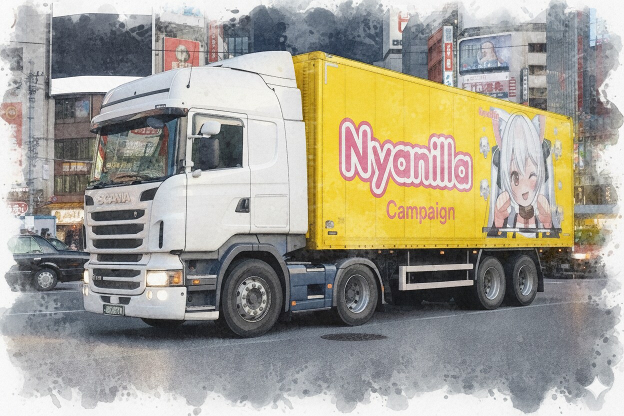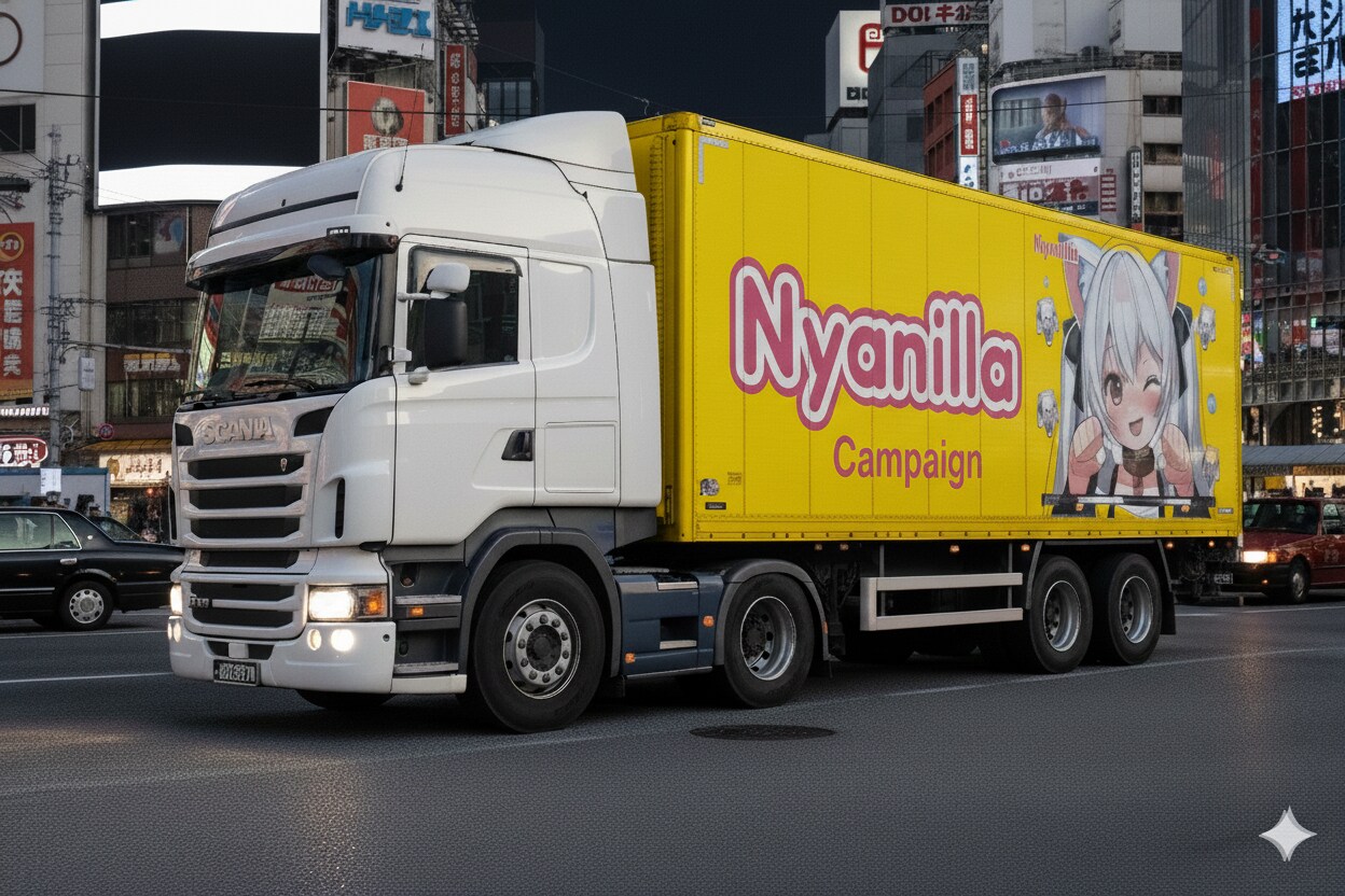にゃんこ専門ケモミミカフェ「Nyanilla」の店員募集のため、巷で評判のトラック側面広告をやってみましたが