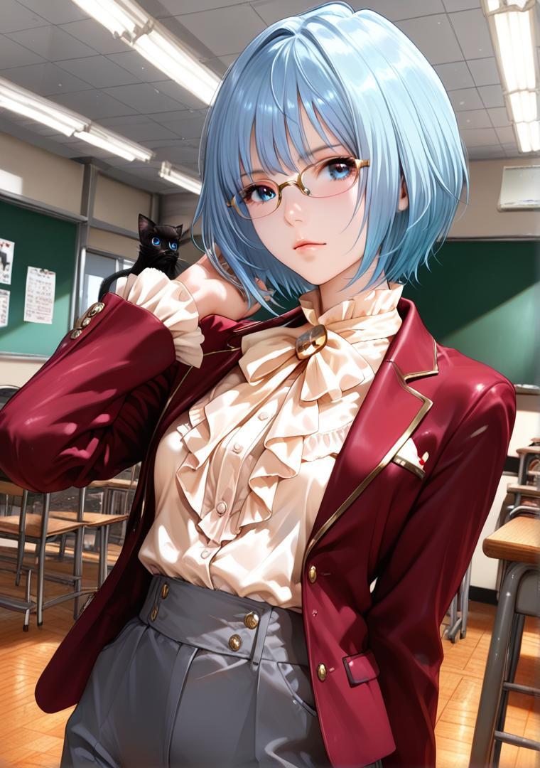 wine red blazer, cream blouse with ruffle detail, gray tailored trousers, black kitten heels, wearing thin gold rim rectangular glasses # 眼鏡教師の華やかオフィス