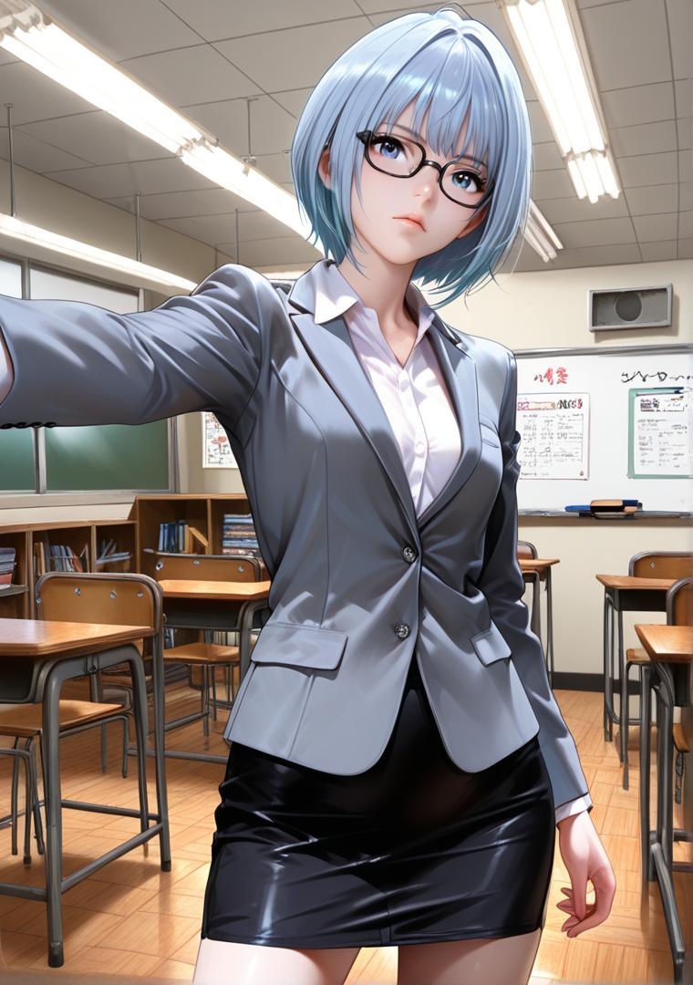 dark teal blazer, white silk blouse, black trousers, black low heels, wearing thin black metal-frame round glasses # 眼鏡教師の知的ビジネス