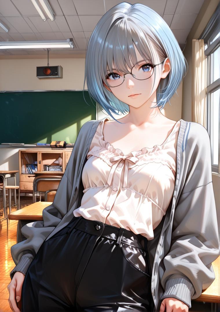 light gray cardigan, cream blouse, charcoal trousers, black pumps, wearing black rimless cat-eye glasses # 眼鏡教師の落ち着きコーデ