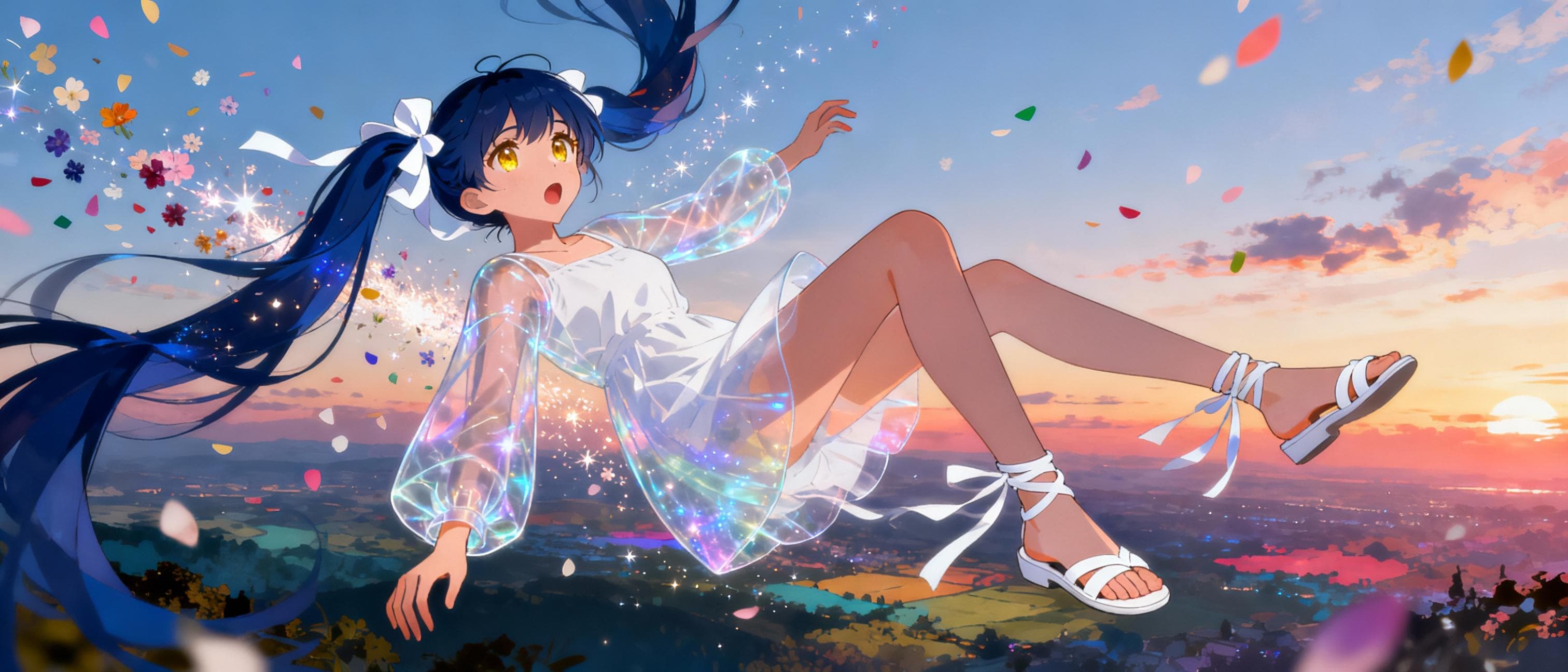 光と花びらを纏い、雲を滑り、「私」という星花は夜明けの空から静かに地上へ降り立った。
