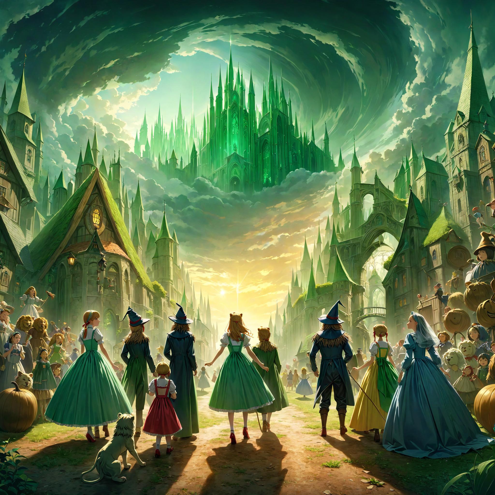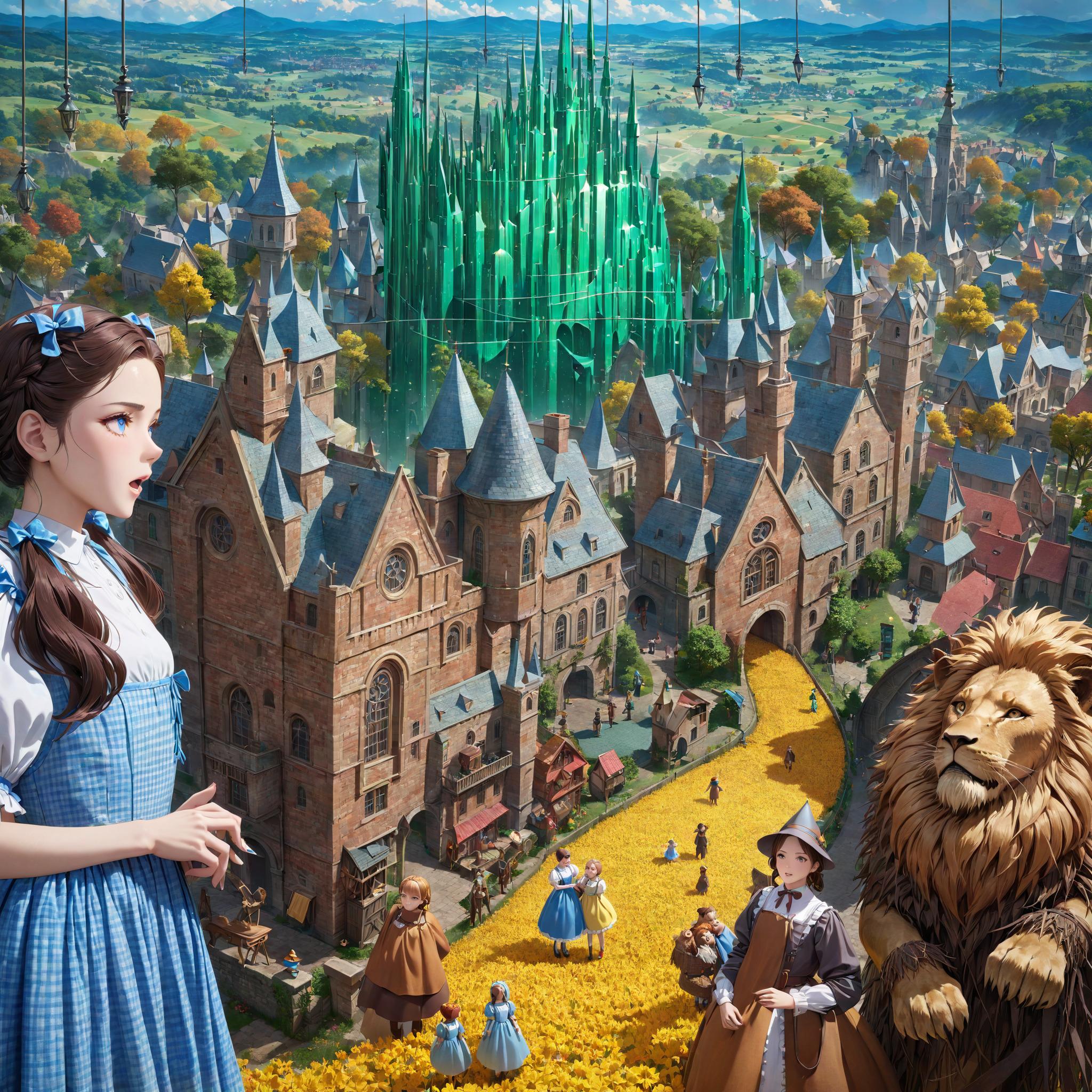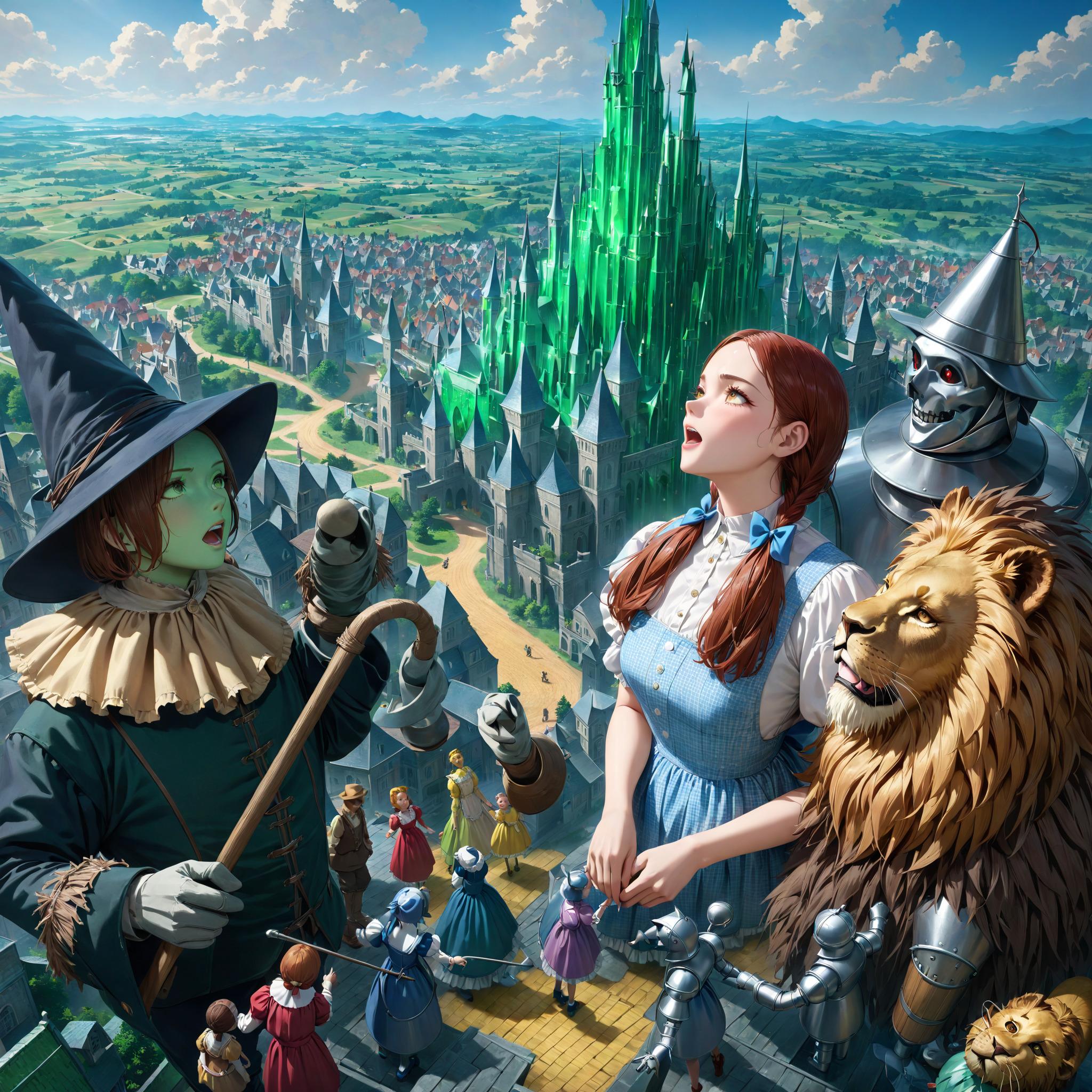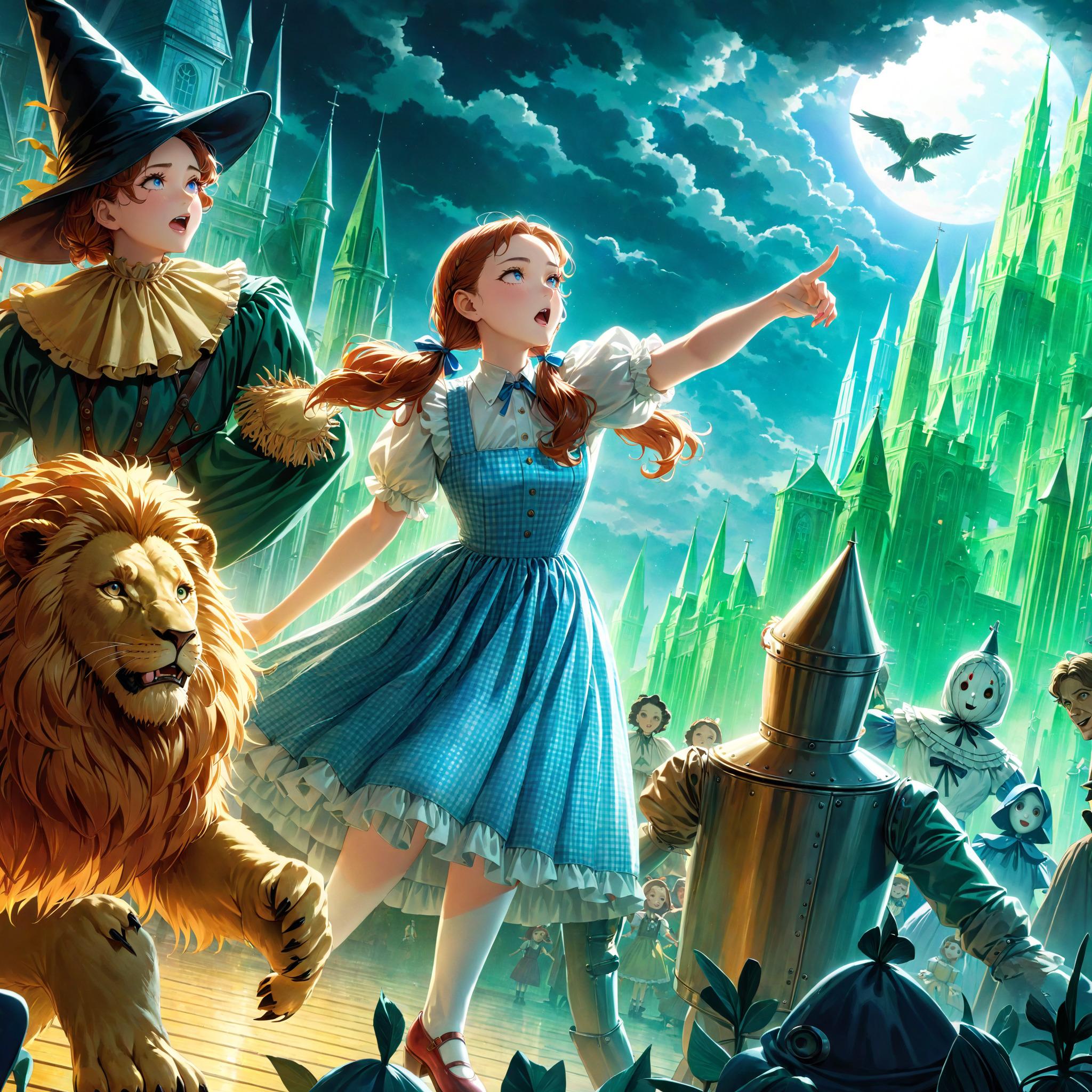 ドロシーはオズの魔法使いに頼んでもと来た世界に戻してもらおうと、脳みそのない案山子、心のないブリキの人形、勇気のないライオンといっしょに彼のいるというエメラルド・シティに向かいます。