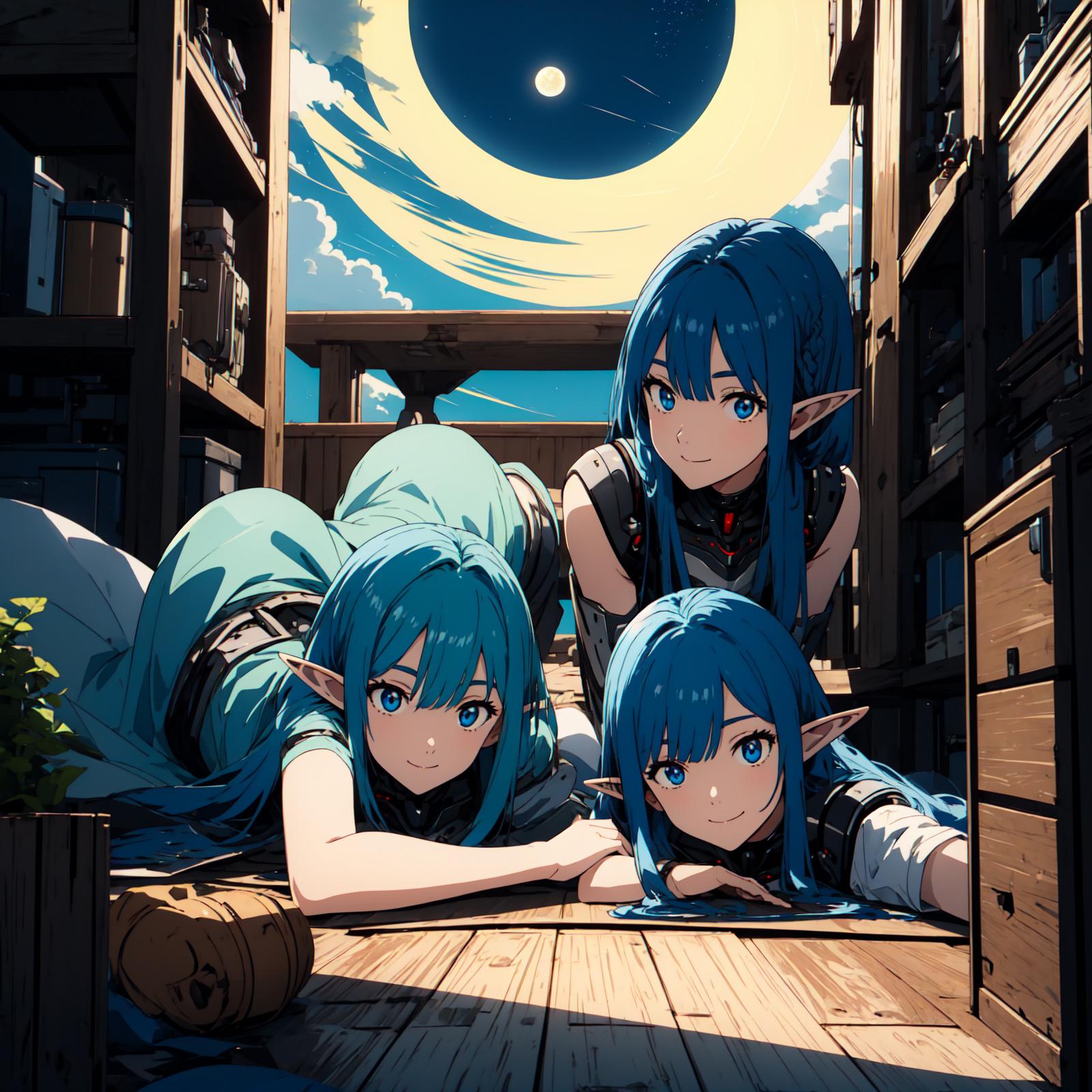 アネ・Ane(青髪のエルフ。おっとりした性格だが魔法は特級クラス、貞操観念はゆるめでその事で妹に心配をかけている)