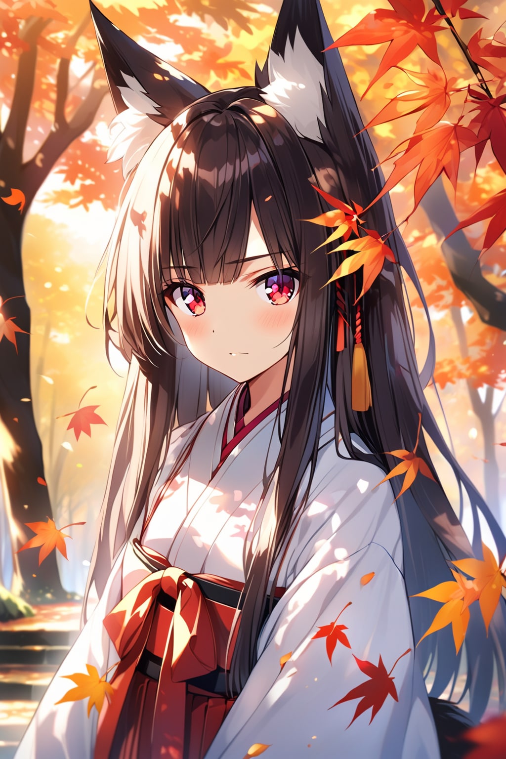 18yo,black hair,long hair,straight hair,fox girl,fox ears,blunt bangs,sidelocks,cute face,red eyes,medium breasts,black fox tail,