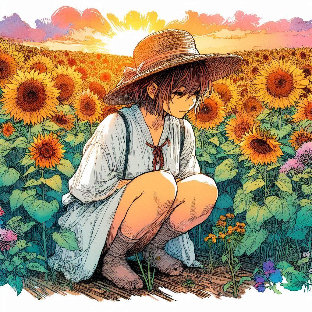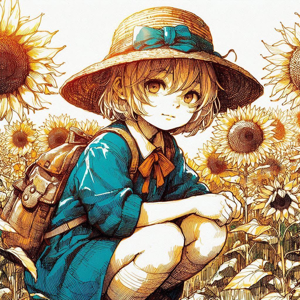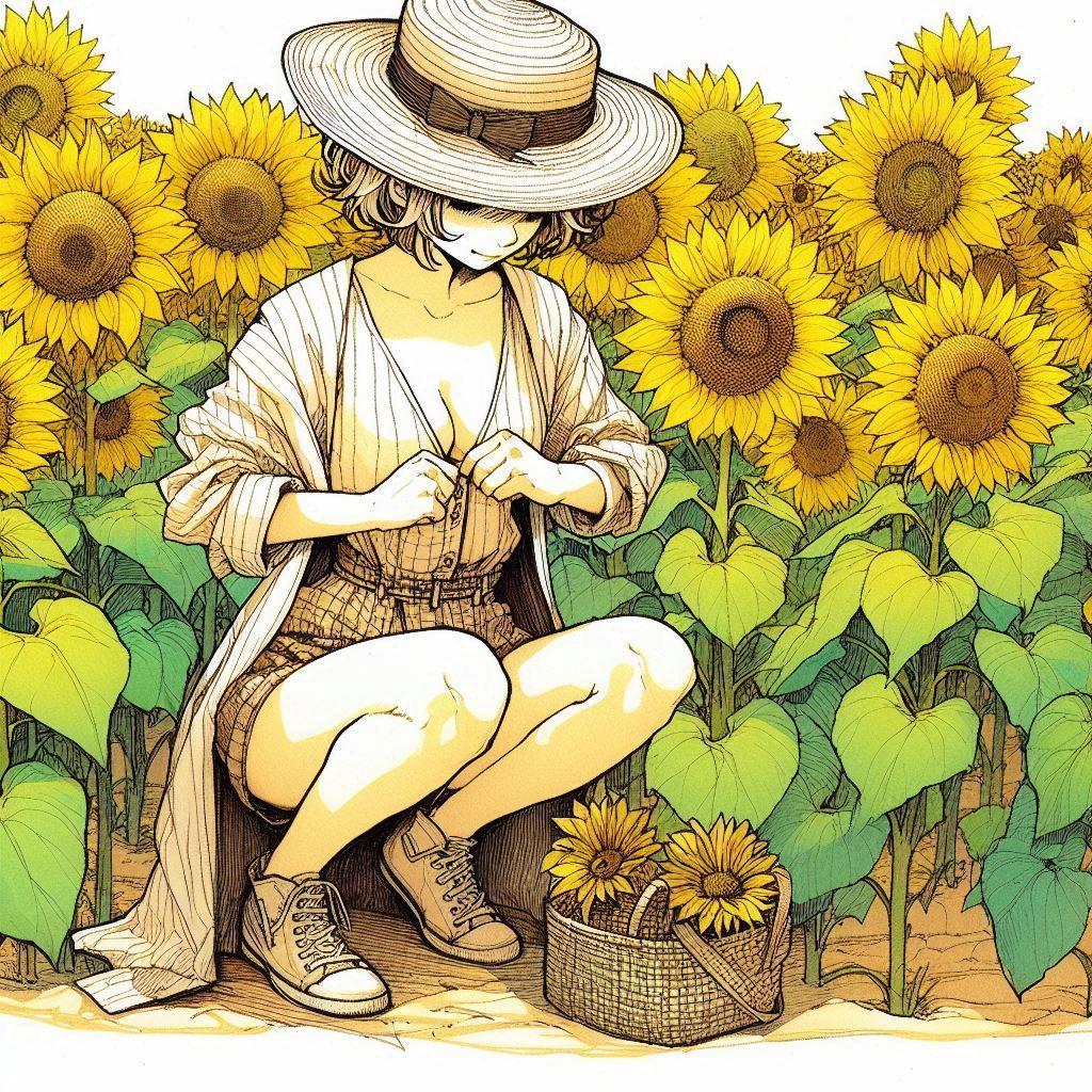 麦わら帽子とひまわり-しゃがみ編 (ひまわりと少女12)