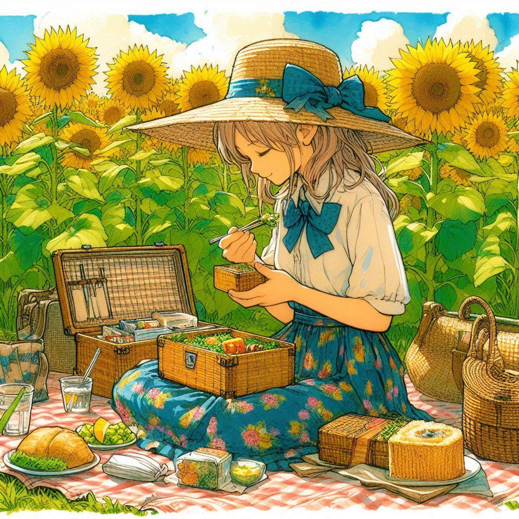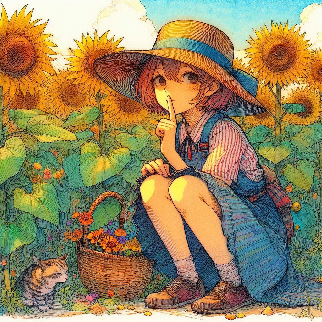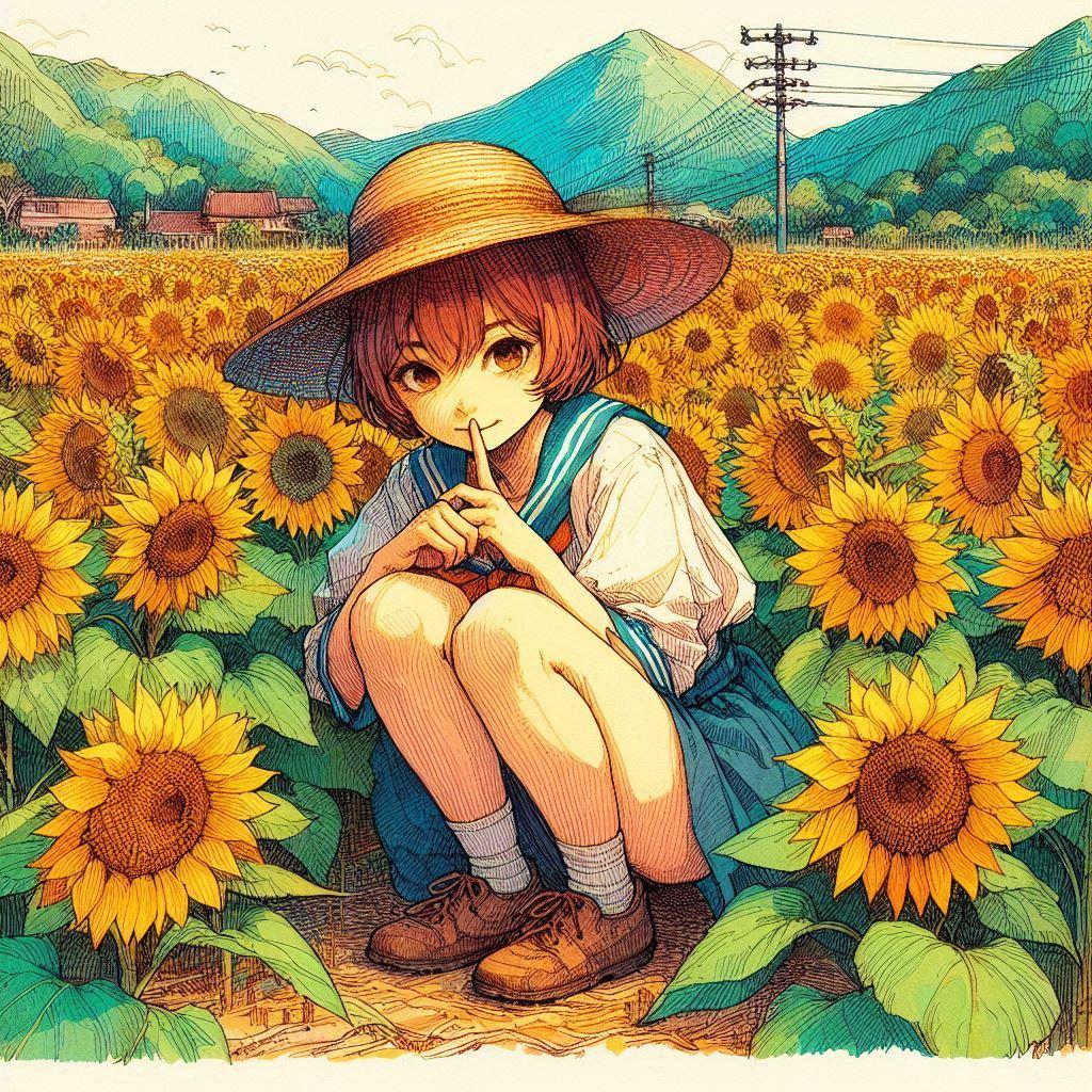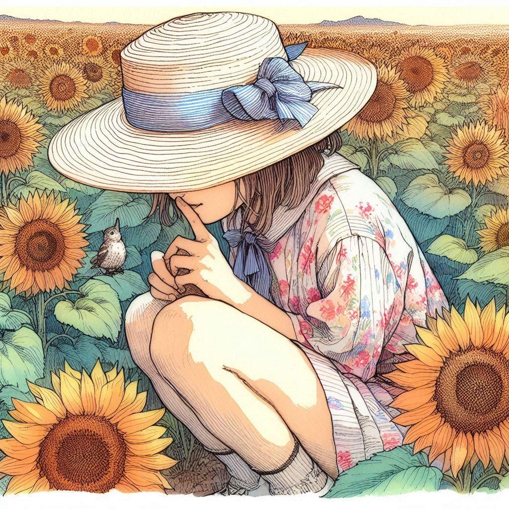 麦わら帽子とひまわり-しゃがみ編 (ひまわりと少女12)