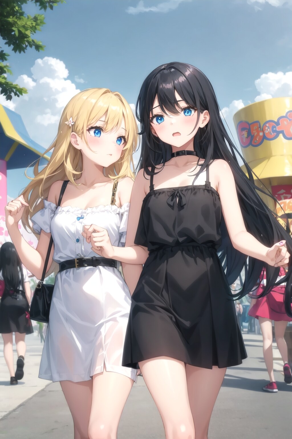 2枚目:隠しキャラの金髪の子が出て来る。正しいプロンプトにしたのに殆ど変わらないので、そもそも「(two girls wearing costumes」が何の仕事もしていない(本当は着ぐるみコスプレをさせたかった)